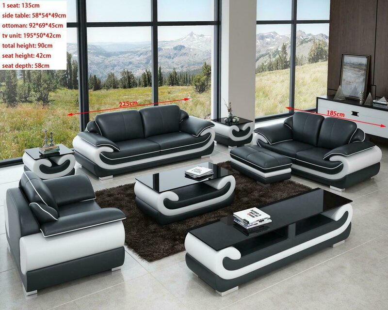 Ontspan Sofaset 3+2+1 zits Set Design Banken Gestoffeerde Bankstellen Leder is een luxueuze en elegant ontworpen bankstel dat comfort en stijl combineert. Met de keuze uit 3-zits, 2-zits en fauteuil, biedt dit prachtige set een perfecte combinatie van functionaliteit en design voor elk interieur. De afmetingen van ca. 225 x 90 x 95 cm voor de 3-zits, 185 x 90 x 95 cm voor de 2-zits en 135 x 90 x 95 cm voor de fauteuil, maken dit set ideaal voor zowel ruime woonkamers als gezellige leeshoeken. Gemaakt van premium ledervezelstof (70% leder / 30% polyester) biedt dit bankstel duurzaamheid en luxe uitstraling. Daarnaast is er optie om te kiezen uit andere hoogwaardige materialen zoals echt leer en textielstof in verschillende kleuropties.