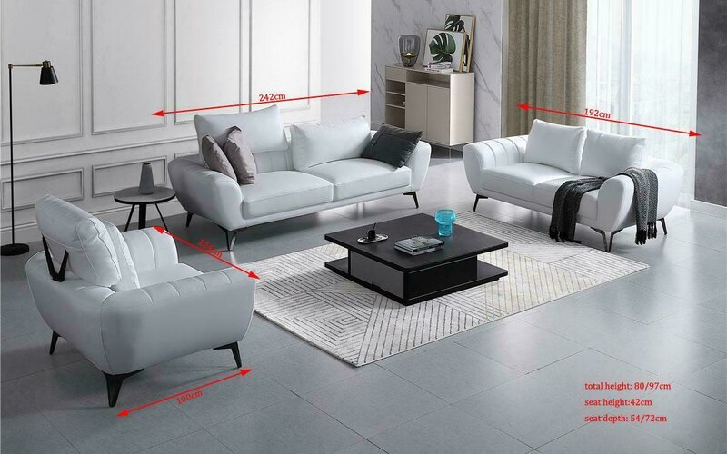 Leren bankstel bank woonlandschap 3+2+1 zitsbank stel ontwerp nieuw: Dit prachtige bankstel biedt een combinatie van comfort en stijl voor uw woonruimte. Met afmetingen van ca. 242 x 80/97 x 100 cm voor de 3-zitsbank, ca. 192 x 80/97 x 100 cm voor de 2-zitsbank en ca. 124 x 80/97 x 100 cm voor de 1-zitsbank, voorziet dit bankstel in zitplaatsen van verschillende groottes. Het is vervaardigd met premium ledervezelstof (70% leder / 30% polyester) en optioneel beschikbaar in verschillende leder- en textielopties voor een gepersonaliseerde look. De bank bevat Italiaans rundleder en een stevig binnenframe van echt hout voor duurzaamheid en comfort.