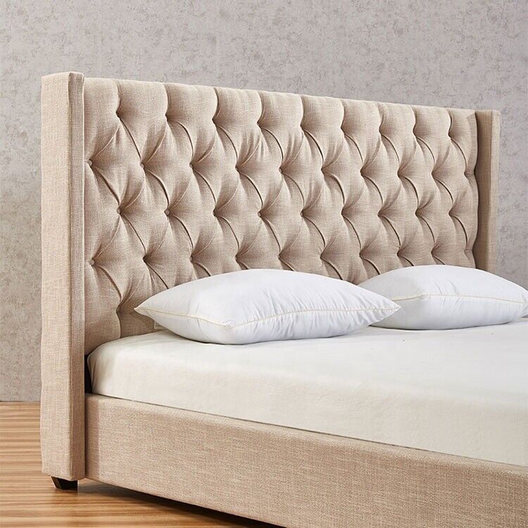 Beige slaapkamer bedden gestoffeerd bed Chesterfield textiel stof nieuw.