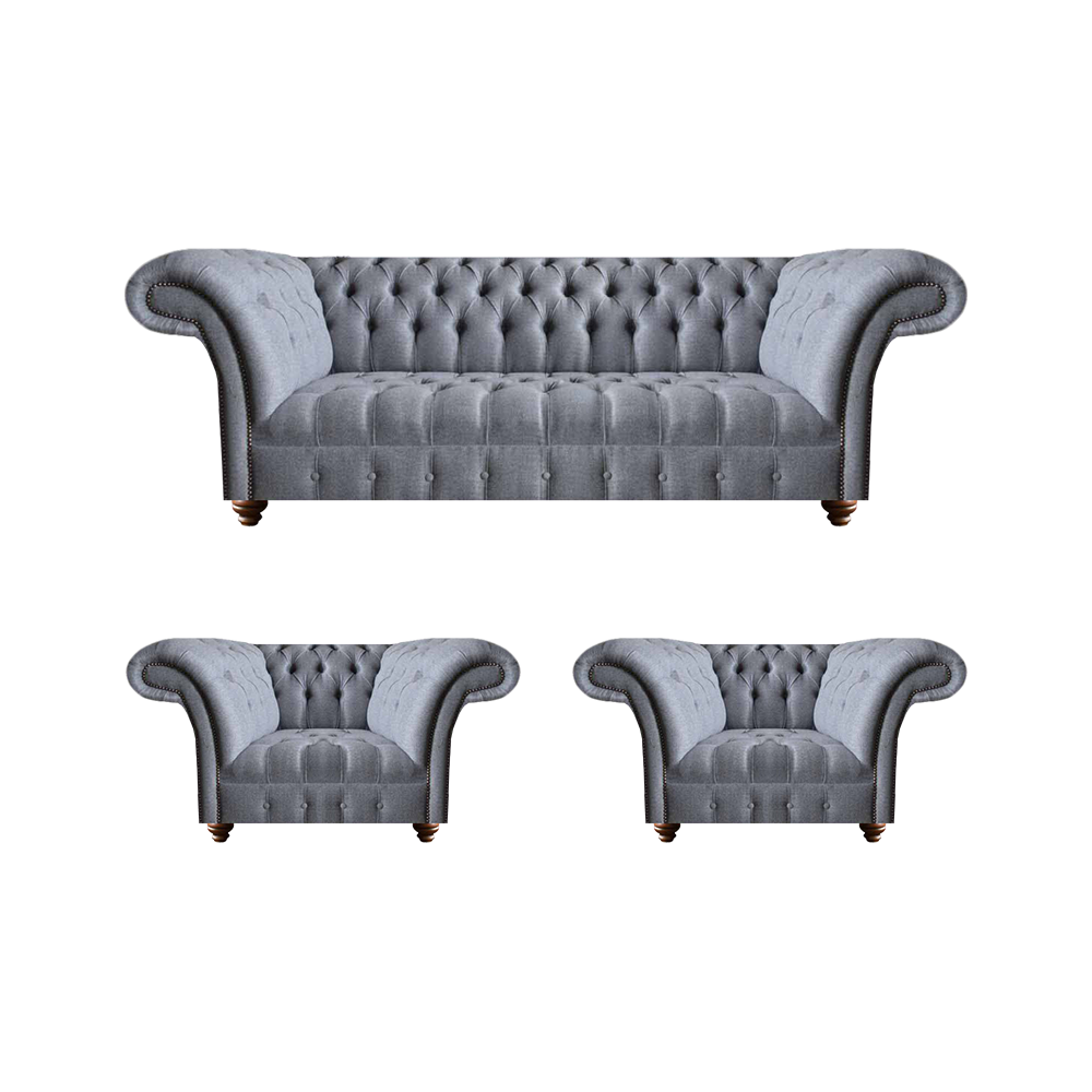 Chesterfield lichtgrijze bankstel elegante bekleding driezitter 2x fauteuils
