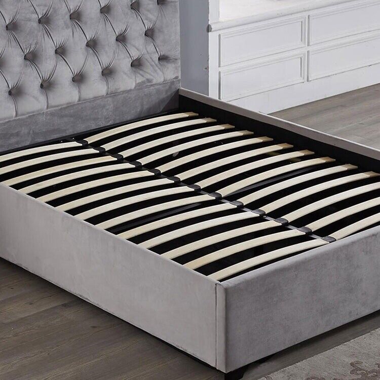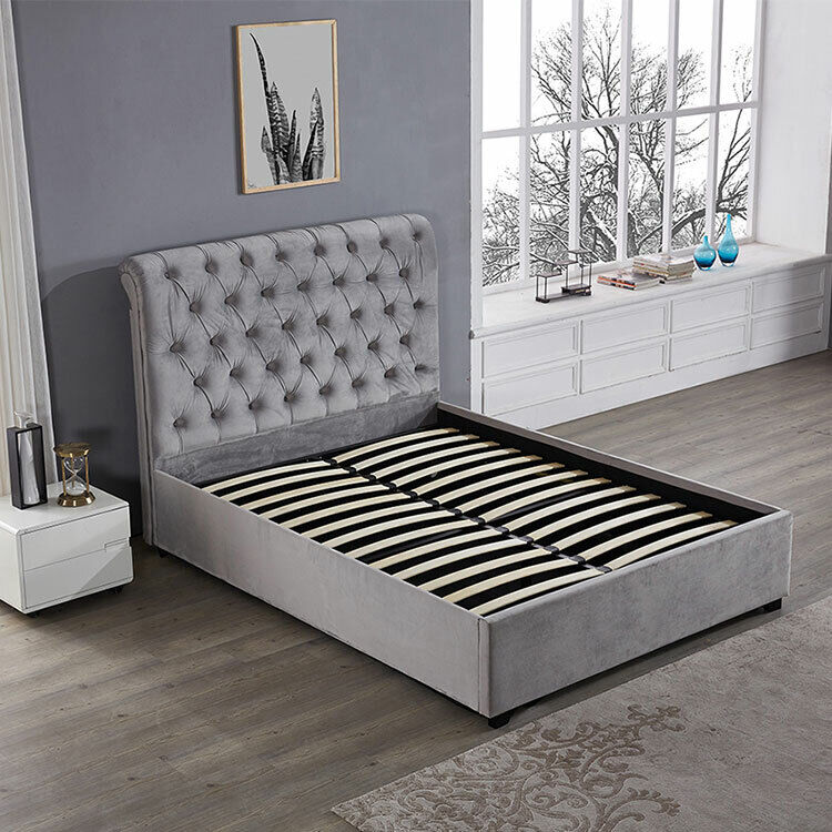 Royale grijze slaapkamer bed gestoffeerde bedden Chesterfield design textiel