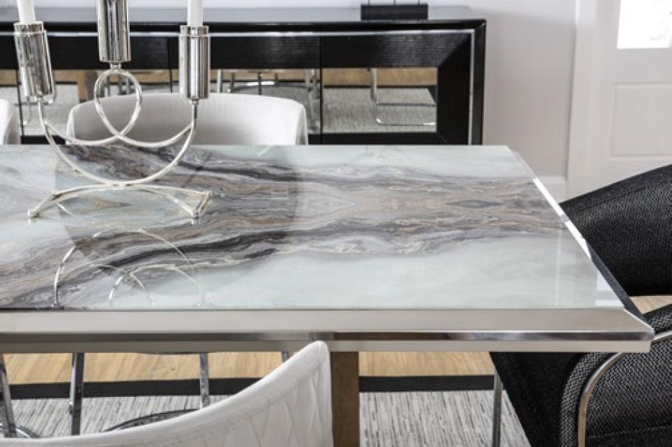 Inricht uw eetkamer met deze luxe eetkamerset om een ​​sfeer van verfijning en klasse te creëren. De harmonieuze combinatie van materialen zorgt voor een modern en toch tijdloos design dat moeiteloos in verschillende interieurstijlen past. Of u nu geniet van een intiem diner voor twee of een feestelijke maaltijd met vrienden, deze set biedt de ideale setting voor elke gelegenheid. De veelzijdigheid van de eettafel en het dressoir maakt ze perfect voor dagelijks gebruik en speciale evenementen. Met andere kleuropties op aanvraag, kunt u deze set aanpassen aan uw persoonlijke voorkeuren en interieur. Kies voor comfort, stijl en functionaliteit met de Eetkamerset Eettafel Set Sideboard Luxe Meubels 4 Stoelen Tafel.