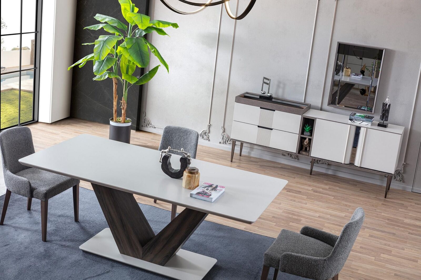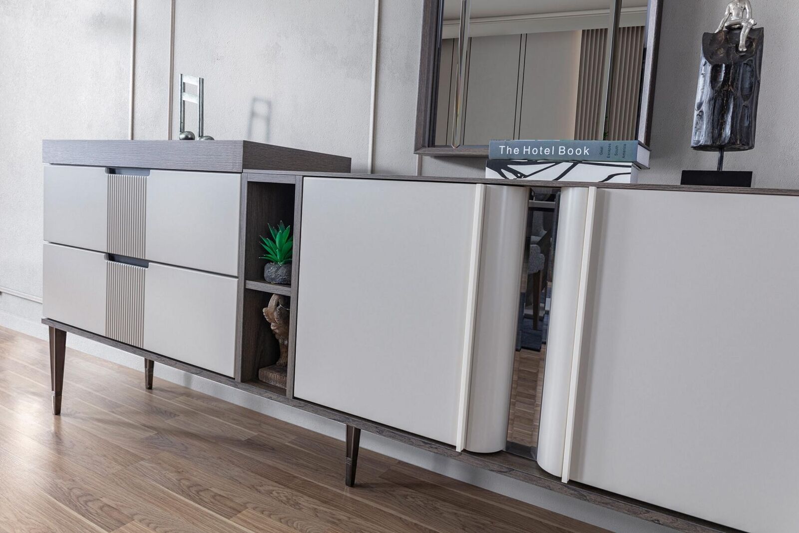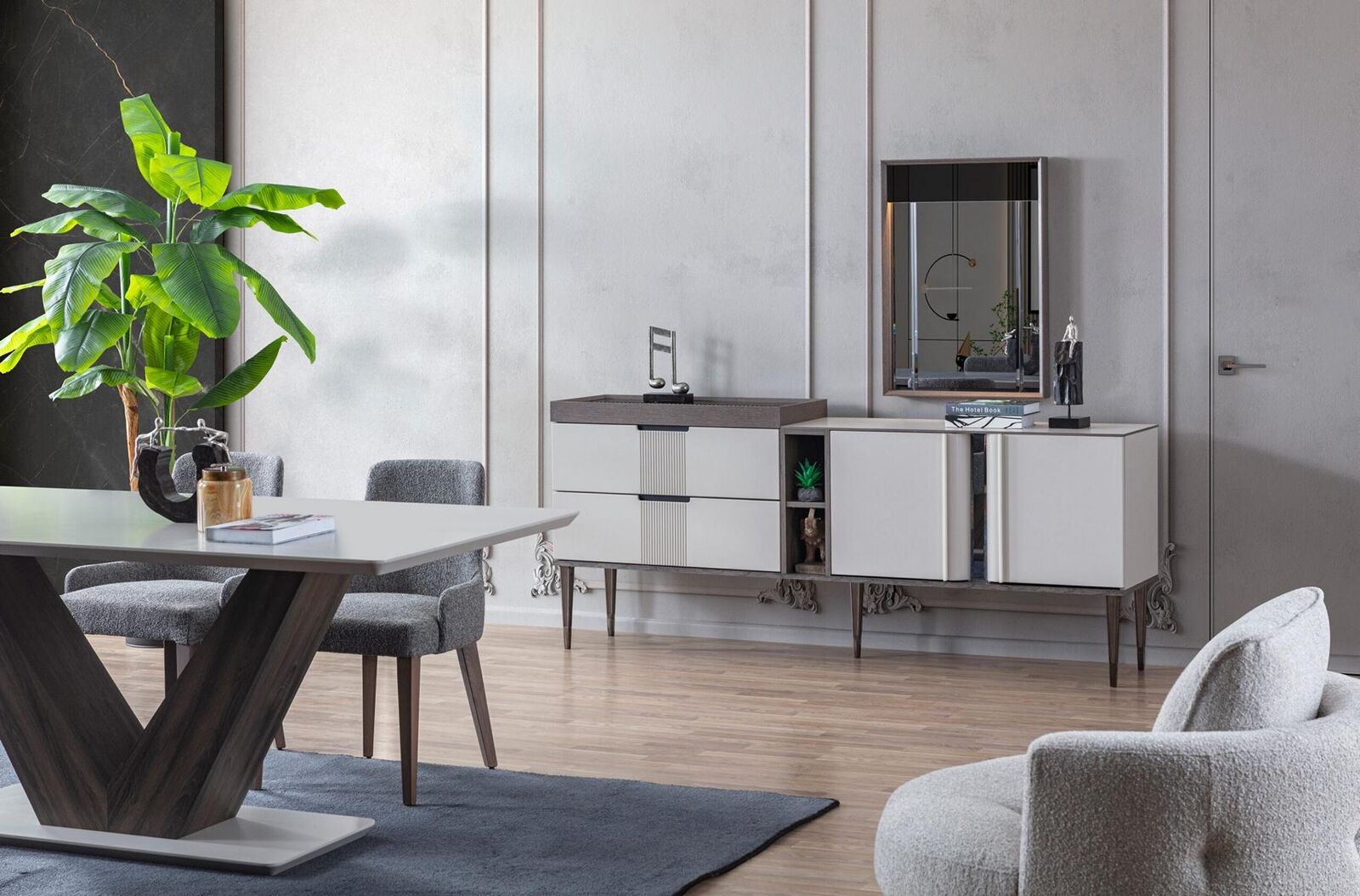 Inricht uw eetkamer met deze luxe eetkamerset en geniet van gezellige diners met vrienden en familie. De eettafel biedt voldoende ruimte om te genieten van heerlijke maaltijden en de stoelen zijn ontworpen voor maximaal comfort. Het dressoir is perfect voor het opbergen van servies en tafellinnen, terwijl de elegante spiegel een gevoel van ruimte en licht toevoegt aan de kamer. Deze set is ideaal voor iedereen die op zoek is naar een complete en stijlvolle eetkamerinrichting. Maak van uw eetkamer een plek waar u graag samenkomt voor gezelligheid en culinaire avonturen.