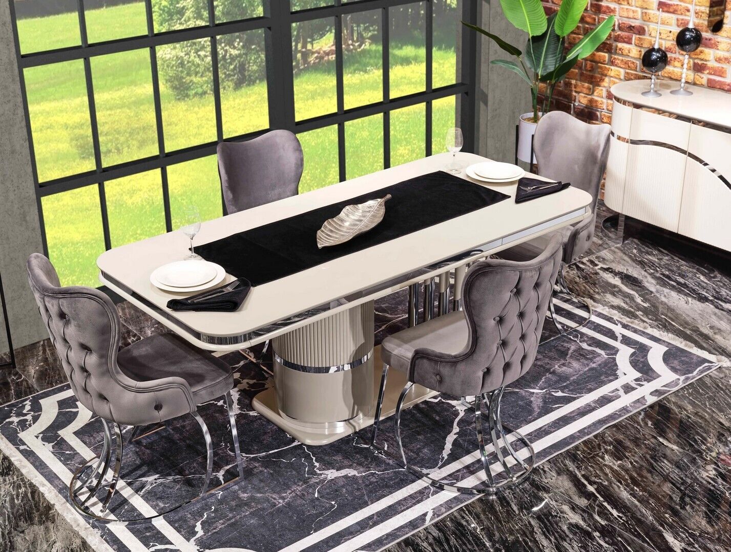 Tafel 6x stoelen 7-delige eetkamer houten eettafel eetkamerset groep ontwerp is een prachtige en functionele toevoeging aan uw eetkamer. Deze set bestaat uit een ruime eettafel en zes stijlvolle stoelen, perfect voor gezellige diners met familie en vrienden. De afmetingen van de eettafel zijn ongeveer 208 x 100 x 81 cm, terwijl de stoelen elk ongeveer 60 x 57 x 85 cm meten. Gemaakt van hoogwaardig hout, textiel en roestvrij staal, is deze eetkamerset duurzaam en stijlvol tegelijk. De kleur is zoals afgebeeld, maar andere kleuren zijn op aanvraag beschikbaar, waardoor u de set kunt aanpassen aan uw persoonlijke voorkeuren.