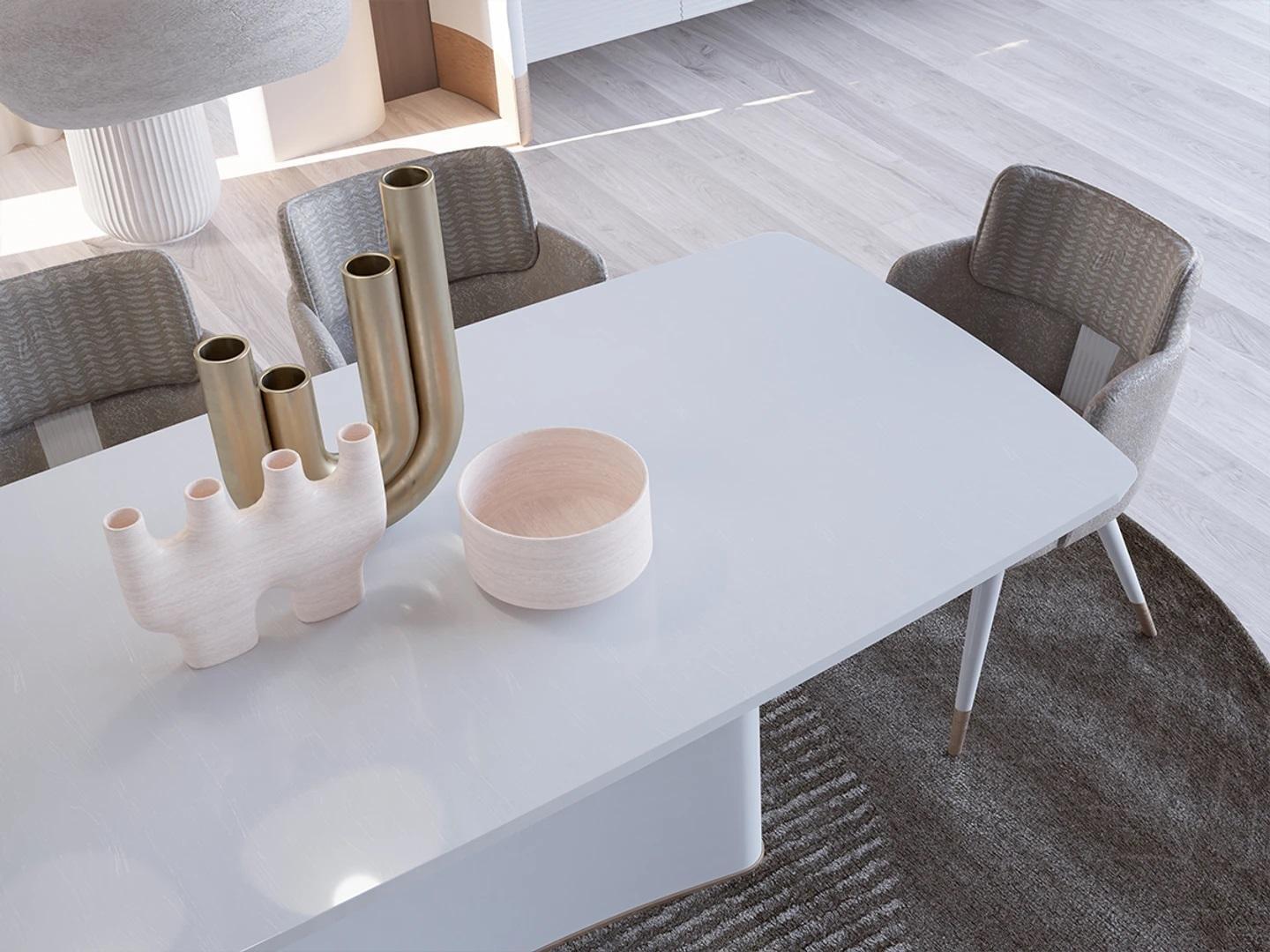 Dit moderne eetkamerontwerp brengt luxe en stijl naar uw eetkamer. De eettafel heeft een royale afmeting van 240 x 110 x 76 cm, waardoor er voldoende ruimte is voor gezellige maaltijden met familie en vrienden. De tafel is vervaardigd van hoogwaardig hout, wat zorgt voor duurzaamheid en een tijdloze uitstraling. De elegante witte kleur van deze tafel past moeiteloos in elk modern interieur en geeft uw eetkamer een frisse en luxe uitstraling.