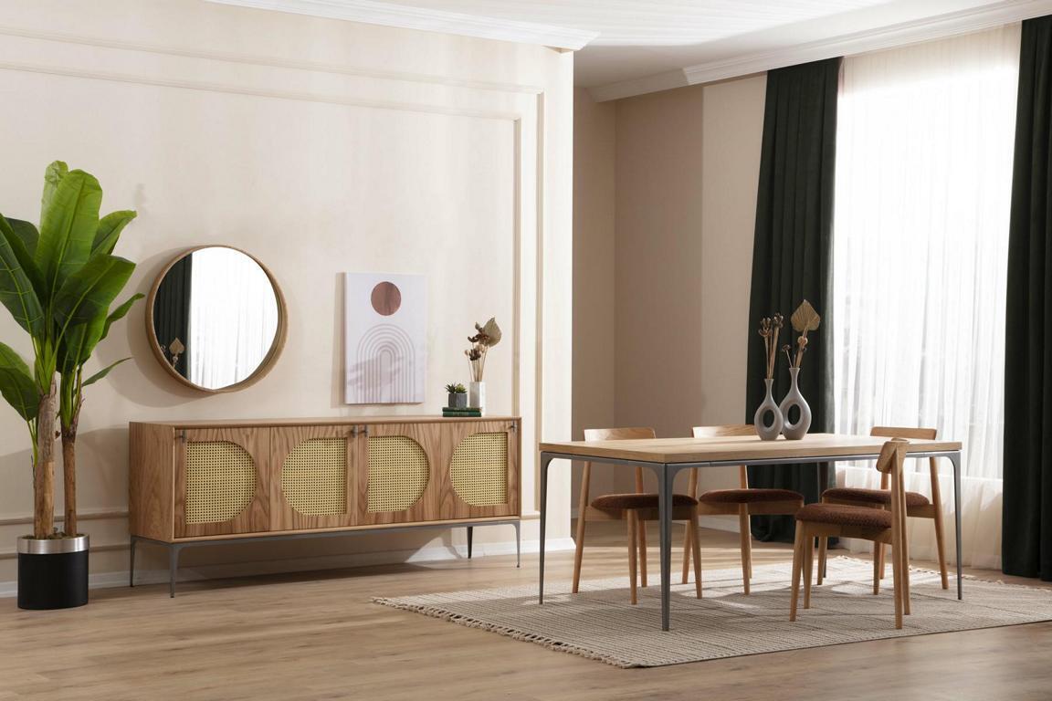 Deze prachtige 7-delige eetkamer set van hout is een perfecte toevoeging aan uw eetruimte. De set bestaat uit een ruime eettafel van ca. 180 x 90 x 75 cm, vier stijlvolle stoelen van ca. 42 x 44 x 80 cm, een elegant dressoir van ca. 200 x 50 x 80 cm, en een sfeervolle spiegel van ca. Ø 70 x 70 cm. De hoogwaardige materialen zorgen voor een duurzame en mooie set die uw interieur een warme uitstraling geeft. De neutrale kleur past perfect bij verschillende interieurstijlen en is een echte blikvanger in uw eetkamer.
