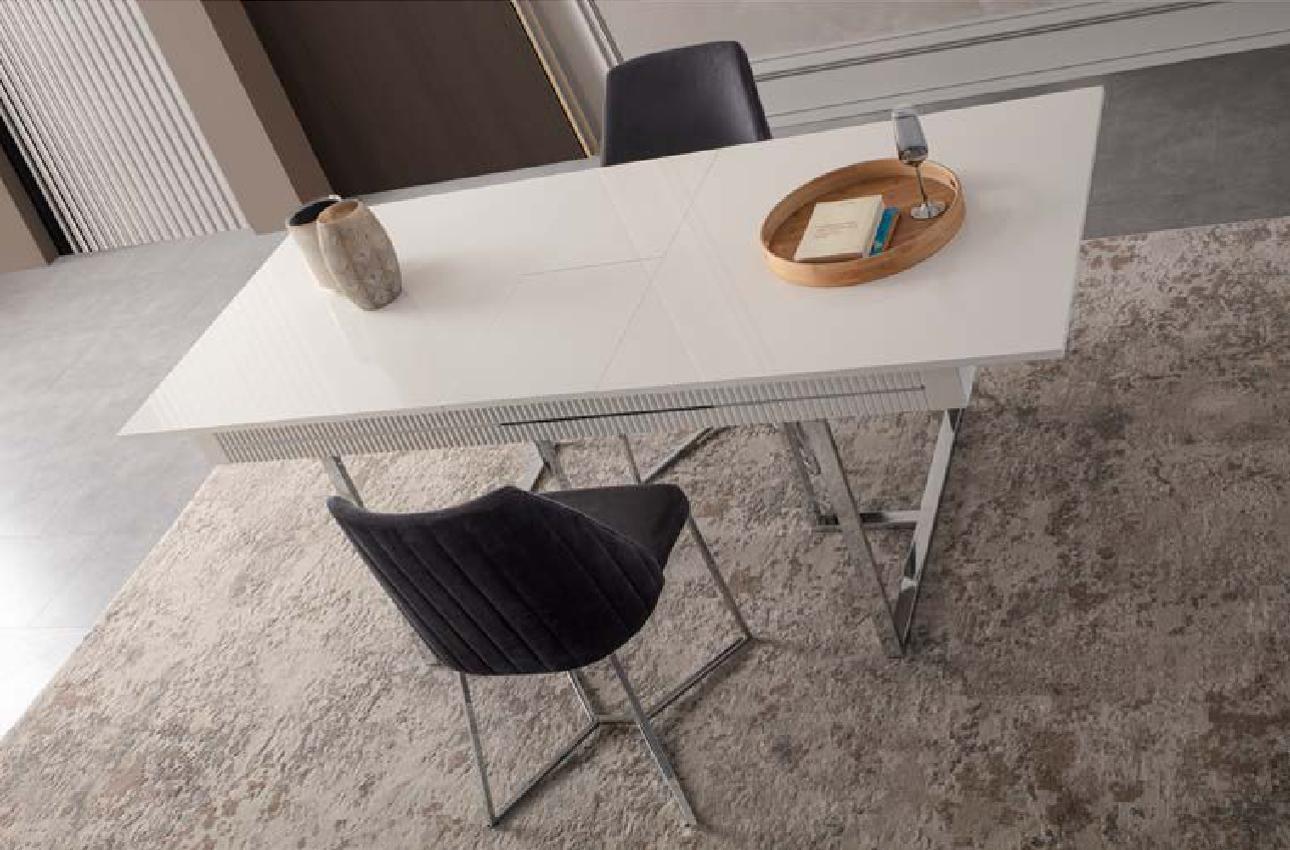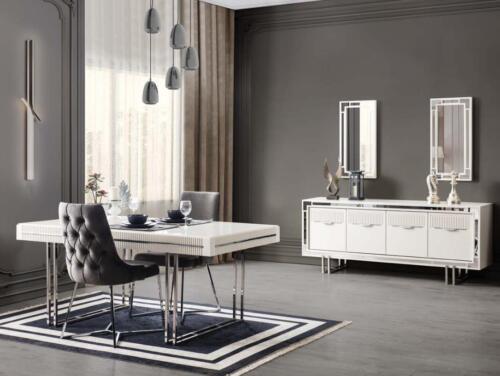 Volledige eettafel met 2 delen dressoir, uittrekbaar eettafel van wit hout.
