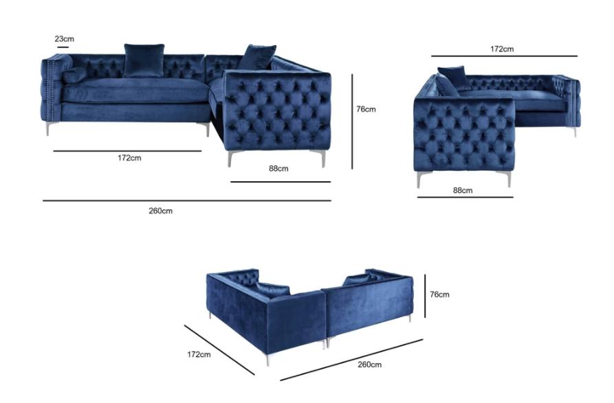 De 'Hoekbank Blauw Chesterfield Bank Hoekopstelling Bekleding Fluweel Stof Hoek Meubelontwerp' biedt een ultieme mix van stijl en comfort voor uw woonruimte. Met een indrukwekkende afmeting van ongeveer 260 x 172 x 76 cm, is deze hoekbank ideaal voor het creëren van een gezellige, luxueuze zithoek. De bank is bekleed met hoogwaardige fluwelen stof, wat zorgt voor een zachte en elegante uitstraling. Met de mogelijkheid om een kleur naar keuze te selecteren, kunt u deze bank perfect afstemmen op uw interieur. Optionele upgrades zoals 100% echt Italiaans rundleer, kristalstenen of zelfs echte Swarovski kristalstenen voegen een persoonlijk tintje toe, voor wie extra luxe zoekt.