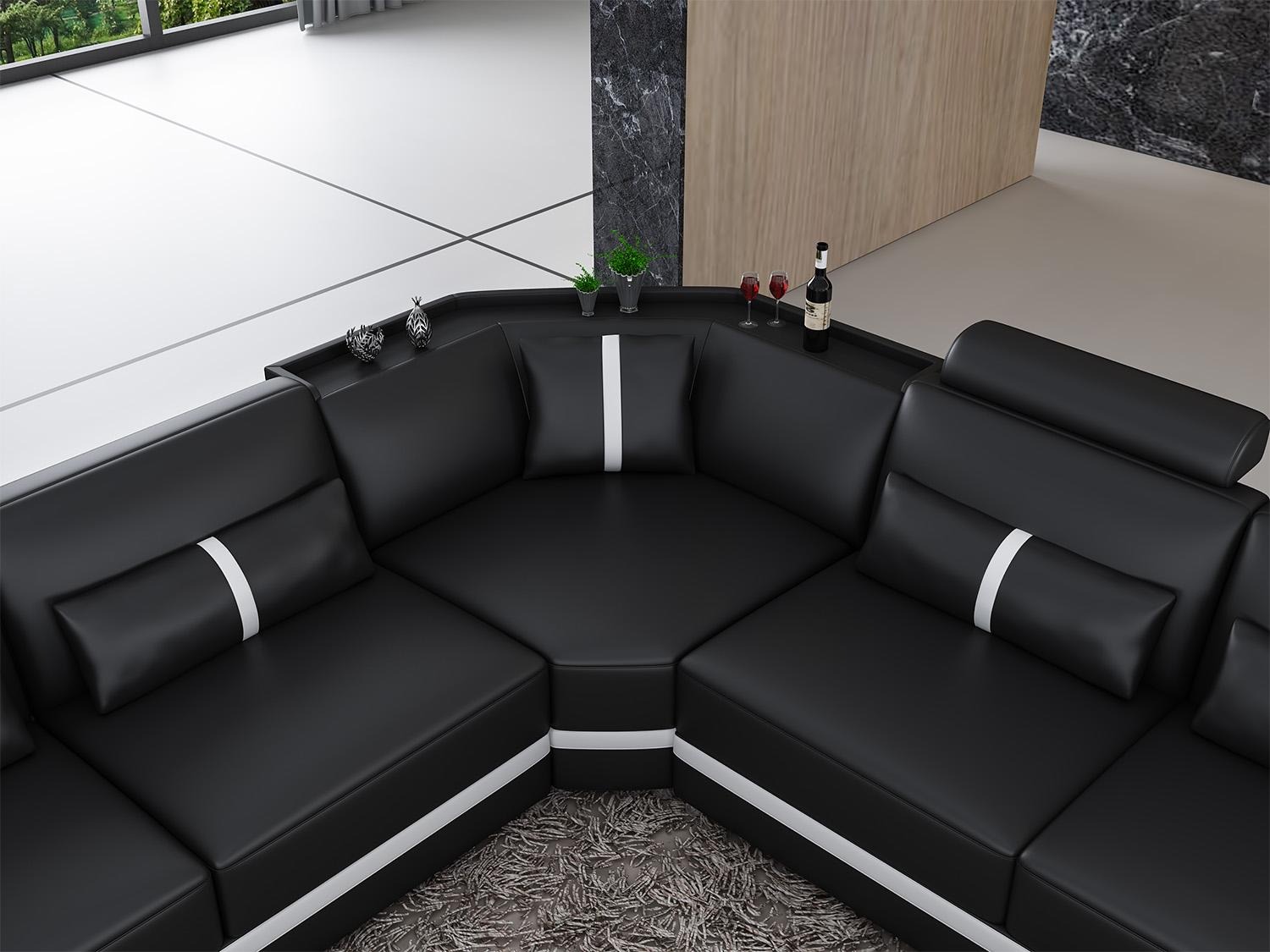 Deze hoekbank in zwart, inclusief een salontafel, is een prachtige aanvulling voor jouw woonkamer. Met premium lederfaserstof (70% leer / 30% polyester) en een moderne hoekopstelling, biedt dit bankstel zowel stijl als comfort. De royale afmetingen van ca. 272 x 393 x 195 cm zorgen voor voldoende zitruimte, terwijl de zithoogte van ca. 42 cm en de diepte van ca. 95 cm een ergonomische ervaring garanderen. De salontafel van 120 x 70 x 42 cm complementeert de hoekbank perfect, en met 3 ingebouwde USB-poorten is opladen van apparaten een eitje. Kies uit verschillende hoogwaardige materialen en personaliseer met optionele upgrades zoals een elektrische Relax-Fußstütze of een Soundsystem met Bluetooth-connectiviteit.