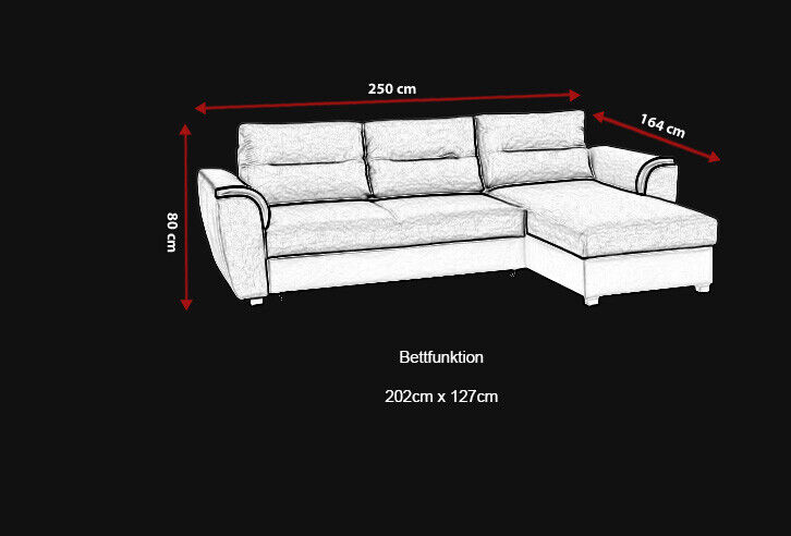 Bank slaapbank ontwerper bank met slaapfunctie + bedlade hoekbank bank nieuw is de perfecte combinatie van stijl, functionaliteit en comfort. Met een afmeting van ca. 250 x 164 cm en een hoogte van ca. 80 cm, biedt deze slaapbank voldoende ruimte om te ontspannen en te slapen. De bank wordt geleverd met een bedfunctie van ca. 202 x 127 cm ligoppervlak, waardoor het ideaal is voor logeerkamers of kleinere ruimtes. De inbegrepen bedlade zorgt voor extra opbergruimte en functionaliteit.