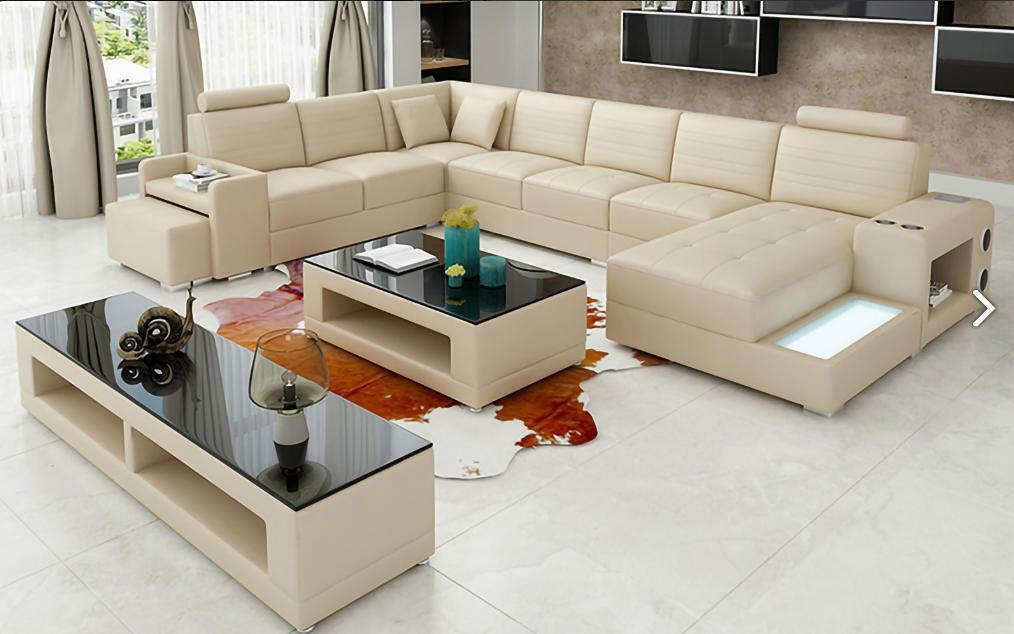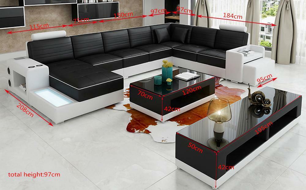Met vier verschillende bekledingsopties om uit te kiezen, waaronder echt leder en textiel, kunt u de bank aanpassen aan uw persoonlijke voorkeur en stijl. De U-vormige indeling zorgt voor een gezellige en uitnodigende sfeer, perfect voor entertainment en ontspanning met familie en vrienden. Het dressoir biedt voldoende opbergruimte en de salontafel is ideaal voor het plaatsen van drankjes en decoratieve items. Met dit moderne ontwerp in zwarte bekleding voegt u een vleugje elegantie toe aan uw leefruimte, terwijl het premium Italiaans rundleder en houten binnenframe zorgen voor langdurig comfort en kwaliteit.