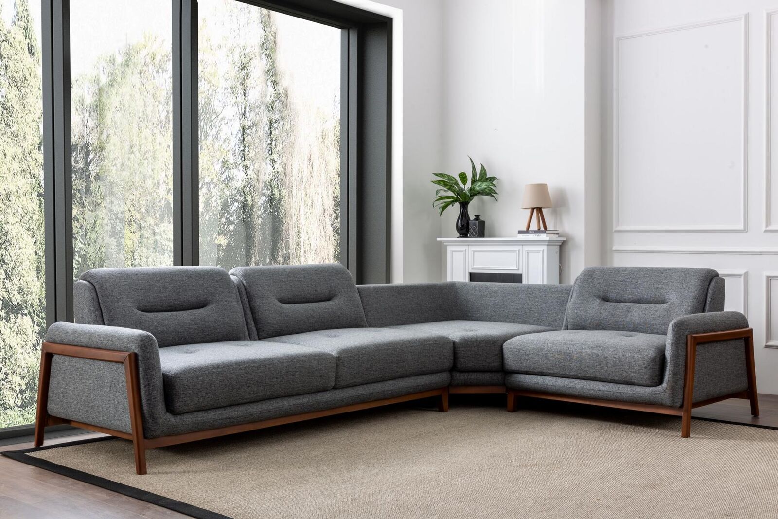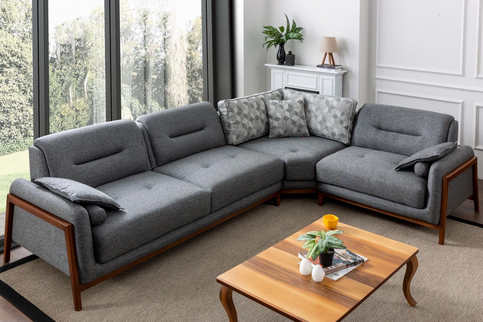 Ontwerper, hoekbank, L-vorm, luxe, bekleding, textiel, woonlandschap, meubels, woonkamer.