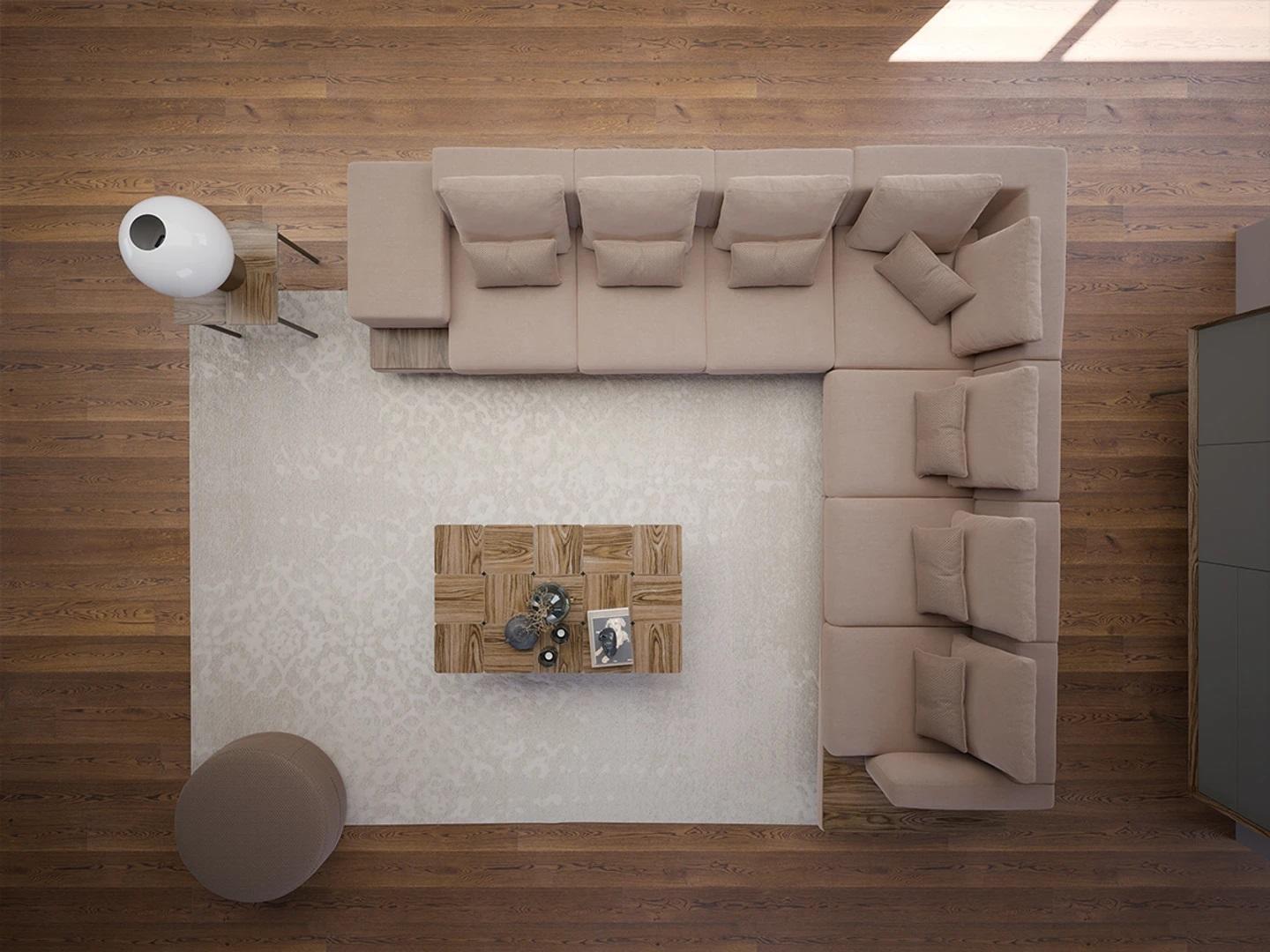 Ontwerper, woonkamer, set, zitmeubelen, hoekbank, L-vorm, hout, salontafel, nieuw, stijlvol, inrichting