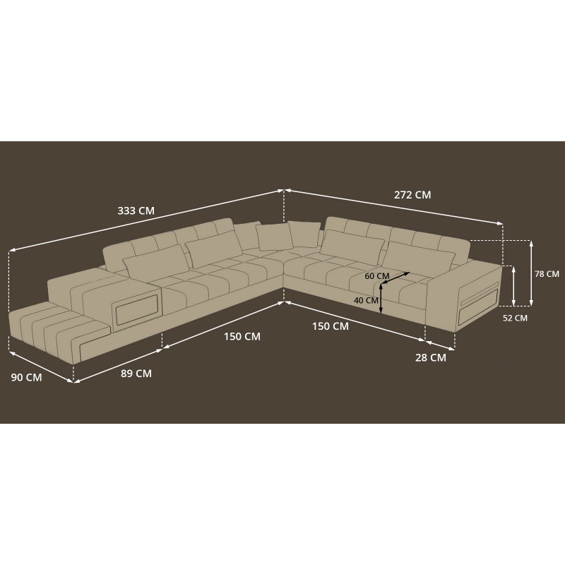 Hoekbank Bank Bank USB bekleding Woonlandschap Leren bankstel ontwerp L Vorm Nieuw Beige is een veelzijdige en stijlvolle toevoeging aan jouw woonruimte. Met afmetingen van ca. 272 x 333 cm (of 333 x 272 cm) en een hoogte van ca. 78 cm biedt deze hoekbank comfortabel zitplaatsen voor het hele gezin. Gemaakt van premium leervezelstof (70% leer / 30% polyester), straalt deze bank luxe uit en is duurzaam in gebruik. Met een zithoogte van ca. 40 cm en diepte van ca. 90 cm (zitdiepte ca. 60 cm) is dit bankstel ideaal voor ontspannen momenten in huis. De **USB-Klikautomaat** met 3-voudige aansluiting is handig ingebouwd, waardoor je eenvoudig elektronische apparaten kunt opladen terwijl je ontspant.