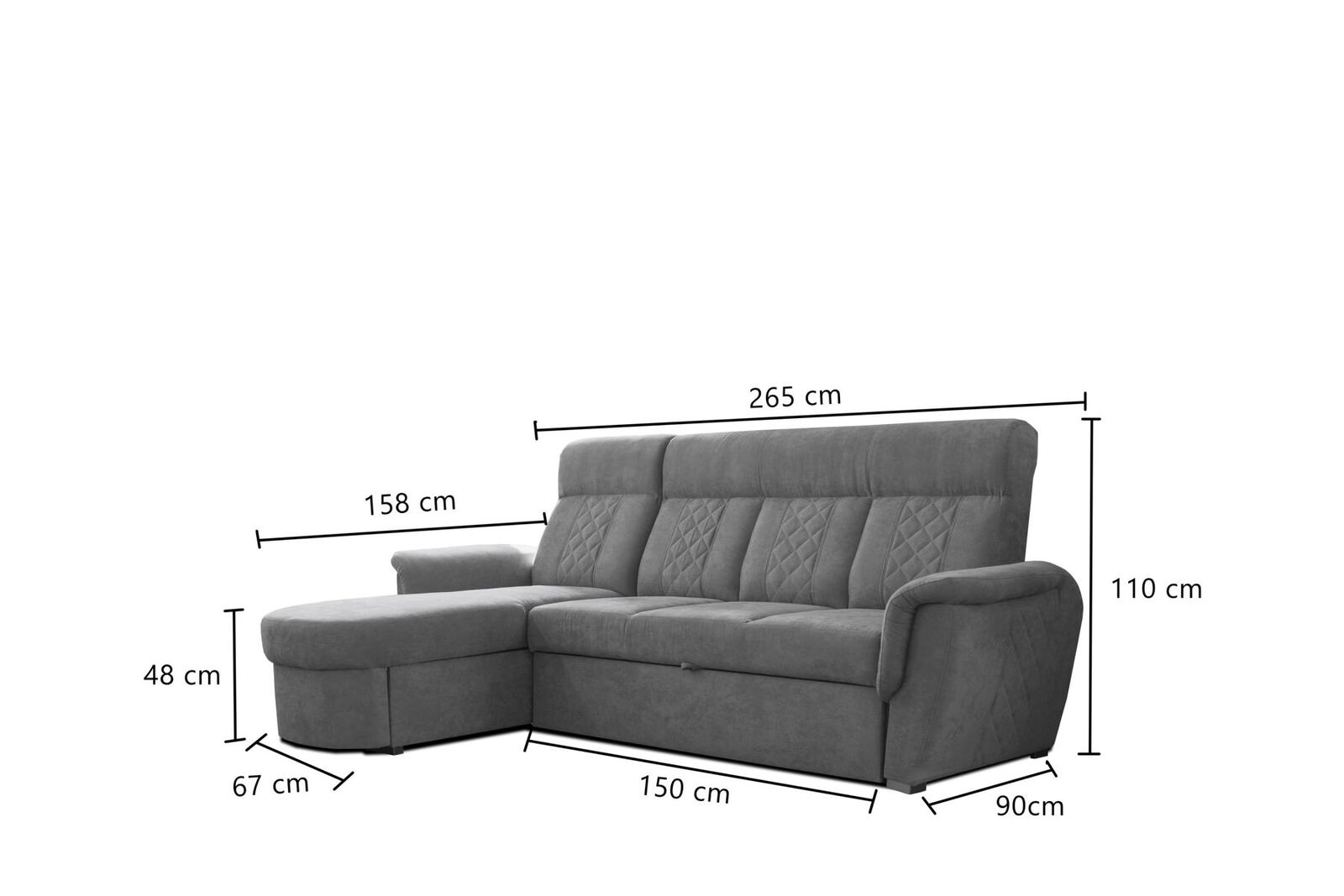Deze exclusieve moderne design hoekbank is een hoogwaardig en stijlvol meubelstuk dat perfect is voor elk eigentijds interieur. De hoekbank is vakkundig vervaardigd met een binnenframe van echt hout, waardoor duurzaamheid en stabiliteit gegarandeerd zijn. Met afmetingen van 265 cm x 158 cm (linker zijde) en 158 cm x 265 cm (rechter zijde), biedt deze bank voldoende ruimte om te ontspannen en te genieten. De zithoogte van ca. 44 cm en zitdiepte van ca. 58 cm zorgen voor optimaal comfort, terwijl de kleur naar keuze ervoor zorgt dat de bank naadloos in elke inrichting past.