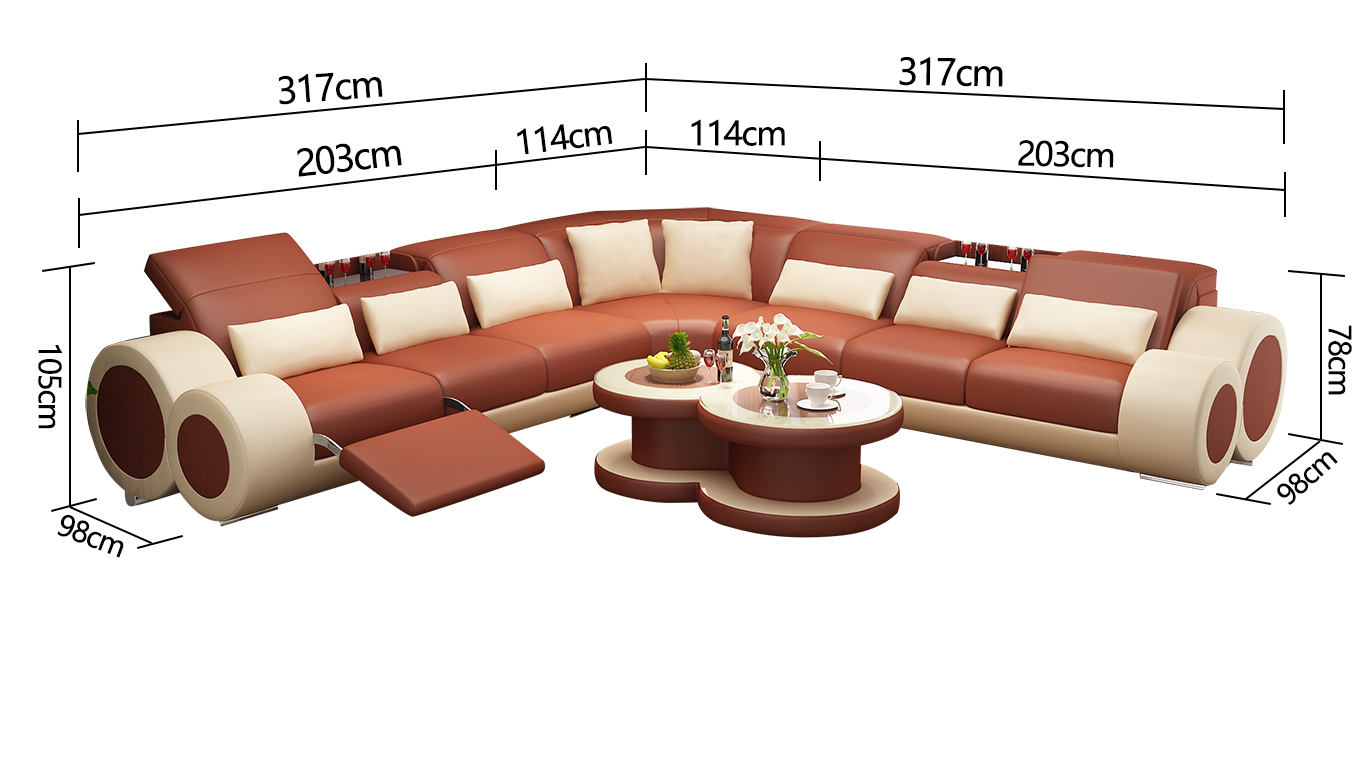 Woonlandschap Designerbank met USB Grote kussens Leren bankstellen Hoek Hoekbank Zwart is een luxueuze toevoeging aan uw woonruimte. Met de afmetingen van ongeveer 317 x 317 cm biedt deze bank een ruime zitervaring. De hoogte van 78-105 cm en zithoogte van ongeveer 42 cm zorgen voor comfortabel gebruik. Deze bank is voorzien van een USB-Klikautomaat (3-voudige aansluiting) INCLUSIEF, waardoor u eenvoudig uw apparaten kunt opladen terwijl u ontspant. De bank is vervaardigd uit hoogwaardig Premium Lederfaserstoff (70% Leder / 30% Polyester), wat zorgt voor duurzaamheid en stijlvolle uitstraling.