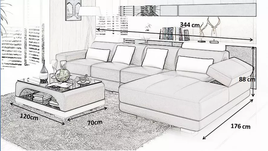 <b>De <i>Leren hoekbank gestoffeerde designerbank Moderne L-vormige bank</i></b> is een luxe en stijlvolle toevoeging aan elk modern interieur. Met premium ledervezelstof (70% leer / 30% polyester) van topkwaliteit en een afmeting van ca. 176 x 344 cm, biedt deze hoekbank maximaal comfort. De zithoogte van ca. 42 cm, diepte van ca. 94 cm en zitdiepte van ca. 58 cm zorgen voor een aangename lounging ervaring. Het binnenframe van echt hout en het Italiaans rundleer uit Italië garanderen duurzaamheid en elegantie. </p>