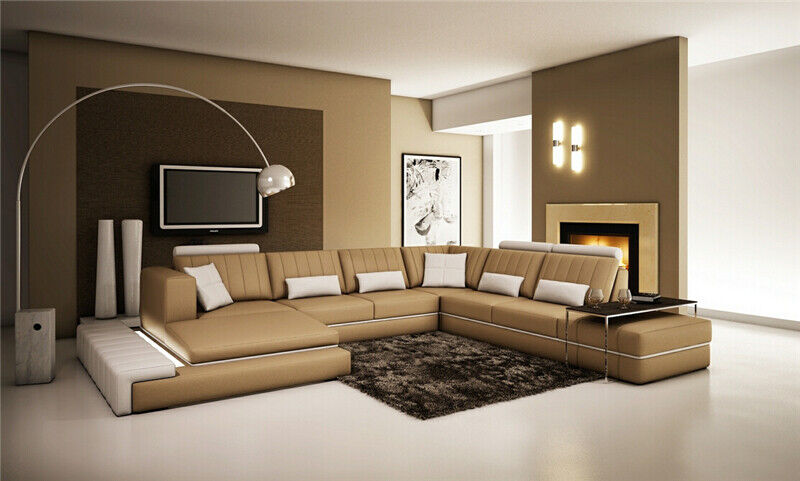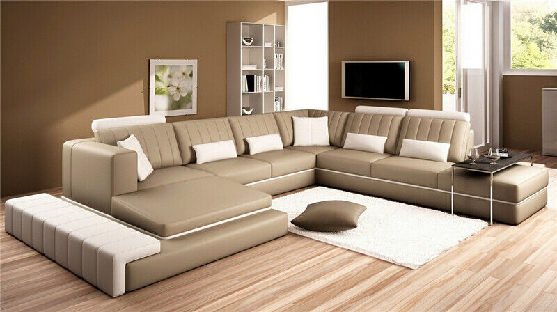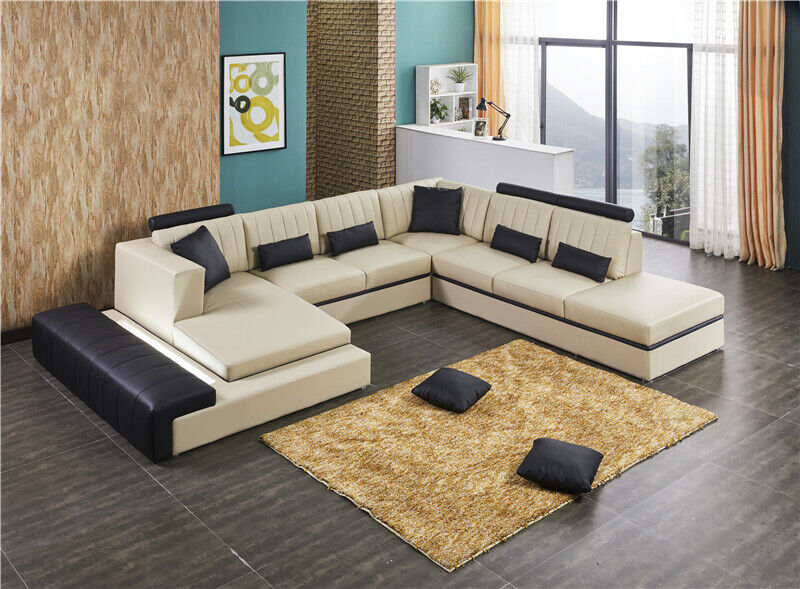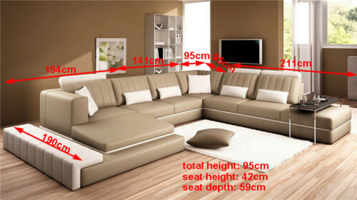 Leder Moderne Bank Woonlandschap Leren Bankstel Bank U-Vorm is een stijlvolle en moderne bank die perfect is voor elk eigentijds interieur. Met de afmetingen van ca. 190 x 390 x 316 cm of 316 x 390 x 190 cm biedt deze bank voldoende ruimte om te ontspannen en te genieten van het comfortabele ontwerp. De bank is gemaakt van premium ledervezelstof (70% leder / 30% polyester), wat niet alleen duurzaamheid garandeert, maar ook een luxe uitstraling toevoegt aan uw woonruimte. De bank heeft een hoogte van ca. 95 cm, een zitdiepte van ca. 59 cm en een zithoogte van ca. 42 cm, waardoor het ideaal is voor langdurig comfortabel zitten.
