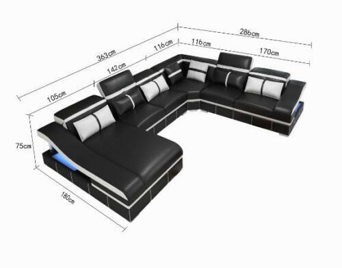 Luxury Corner Sofa U-Shaped Living Landscape Sofa Couch Upholstered Suite Modern Sofas New: Met deze luxe U-vormige hoekbank haal je stijl en comfort in huis. De sofa is vervaardigd met hoogwaardige materialen, waaronder premium ledervezelstof (70% leer / 30% polyester), wat zorgt voor duurzaamheid en een luxueuze uitstraling. De afmetingen van ca. 180 x 363 x 286 cm of ca. 286 x 363 x 286 cm bieden voldoende zitruimte voor gezellige avonden met familie en vrienden. Met een zithoogte van ca. 45 cm en zitdiepte van ca. 58 cm, is deze bank perfect voor ontspanning en comfort.