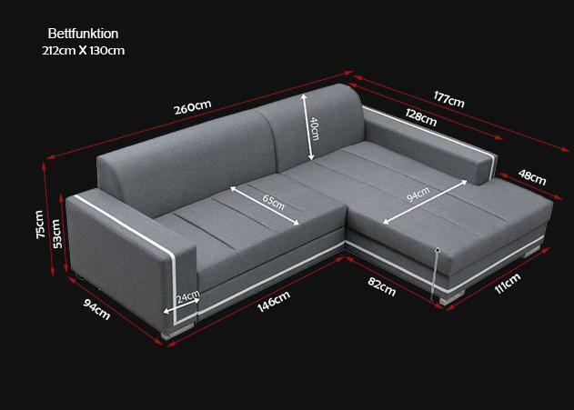 Bank Slaapbank Designbank met slaapfunctie + opbergruimte Hoekbank Couch NIEUW biedt veelzijdigheid en comfort in één stijlvol meubelstuk. Met afmetingen van ongeveer 260 x 177 cm en een hoogte van 75 cm, is deze hoekbank perfect voor elke woonruimte. De slaapfunctie van ca. 212 x 130 cm biedt extra slaapruimte voor gasten, terwijl de bedlade en opbergruimte zorgen voor handige ruimtebesparing. De bank wordt geleverd met een binnenframe van echt hout en veerkern voor duurzaamheid en comfort.