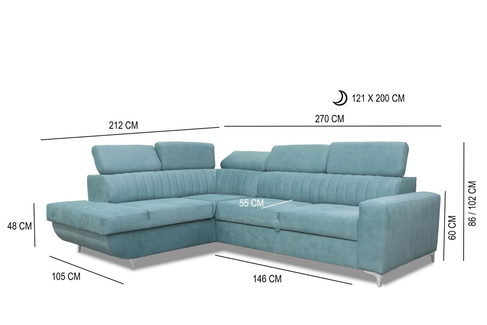 Sofa's L-vorm Textiel Bank Hoek Zitbank Woonkamer Modern Groene Bank Meubels is een stijlvolle en moderne hoekbank die perfect is voor de woonkamer. Met afmetingen van 270 cm x 212 cm aan de linkerzijde en 212 cm x 270 cm aan de rechterzijde, biedt deze bank voldoende ruimte om comfortabel te zitten. De hoogte van 86/102 cm zorgt voor een ergonomische zithouding, terwijl de zithoogte van ongeveer 48 cm en zitdiepte van ongeveer 55 cm zorgen voor optimaal comfort. De bank heeft een diepte van ongeveer 105 cm en een slaapgebied van ca. 121 x 200 cm, wat handig is voor gasten of dutjes.