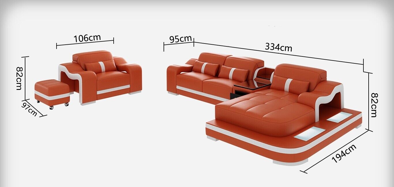 Geniet van ultiem comfort en stijl met deze prachtige woonlandschap hoekbank L-vorm fauteuil set garnituur, perfect voor elk modern interieur. De hoekbank heeft royale afmetingen van 334 x 194 cm en 194 x 334 cm, met een comfortabele zithoogte van ca. 42 cm en diepte van ca. 95 cm. De fauteuil meet ca. 106 x 97 x 82 cm en biedt een knusse zitplek. Gemaakt van premium leervezelstof (70% leer / 30% polyester), combineert deze set luxe en duurzaamheid in één. Het Italiaanse runderleer zorgt voor een luxueuze uitstraling, terwijl het binnenframe van echt hout solide ondersteuning biedt.