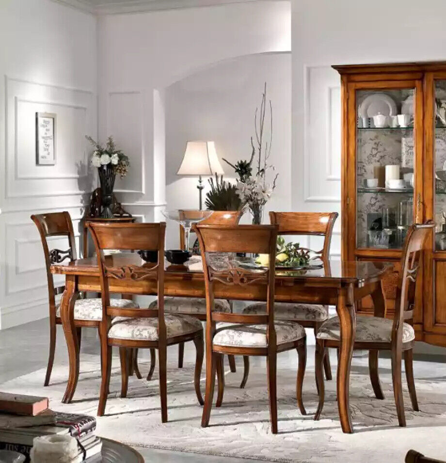 Eettafel 6x stoelen Eetkamer Eethoek Houten dressoir 9-delige set is een prachtige meubelset die je eetkamer direct transformeert en een stijlvolle uitstraling geeft. De set bestaat uit een ruime eettafel met afmetingen van ca. 180 x 100 x 78 cm en zes comfortabele stoelen met een luxe uitstraling. Het bijpassende houten dressoir meet ca. 200 x 52 x 113 cm en de elegante vitrine is ca. 163 x 45 x 207 cm. De set is zoals afgebeeld in een tijdloze kleur, perfect voor elk interieur. Gemaakt van hoogwaardig hout, is deze set duurzaam en van hoge kwaliteit.