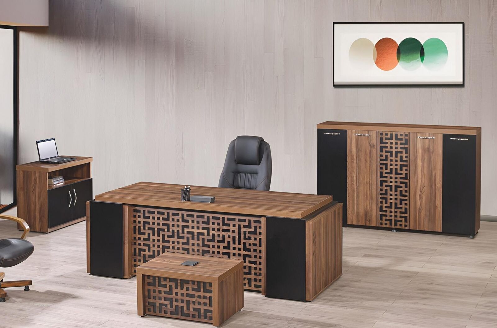 Of u nu thuis werkt of een professionele werkomgeving wilt creëren, deze set biedt alles wat u nodig heeft om georganiseerd en efficiënt te blijven. De warme bruine kleur past goed bij diverse interieurstijlen en zorgt voor een gezellige sfeer. Het gebruik van hoogwaardig hout als materiaal zorgt niet alleen voor een mooie uitstraling, maar ook voor een langdurige levensduur. Breng uw kantoor naar een hoger niveau met deze elegante en functionele meubelset.