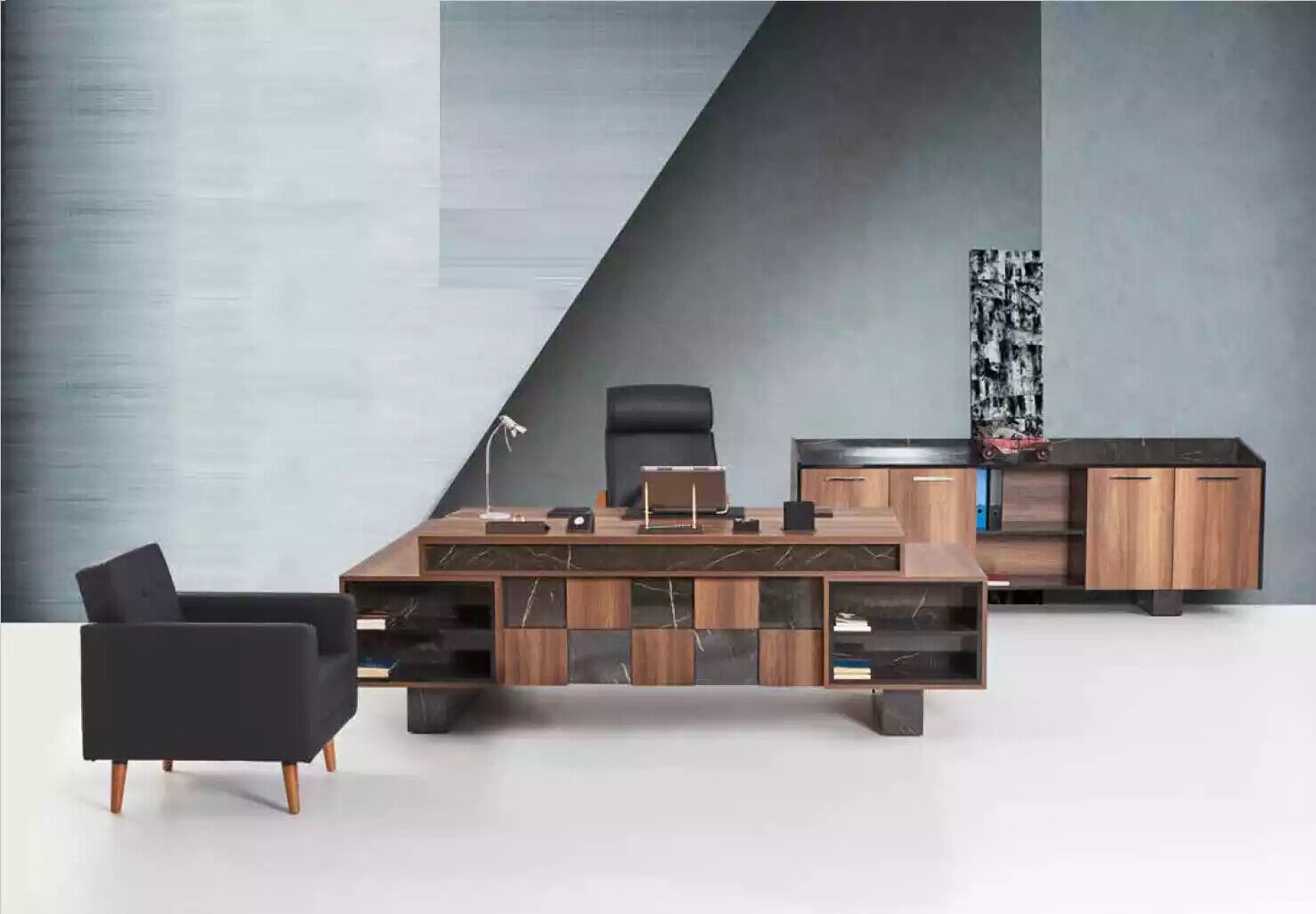 Kantoormeubelen, hoekbureau, salontafel, kast
