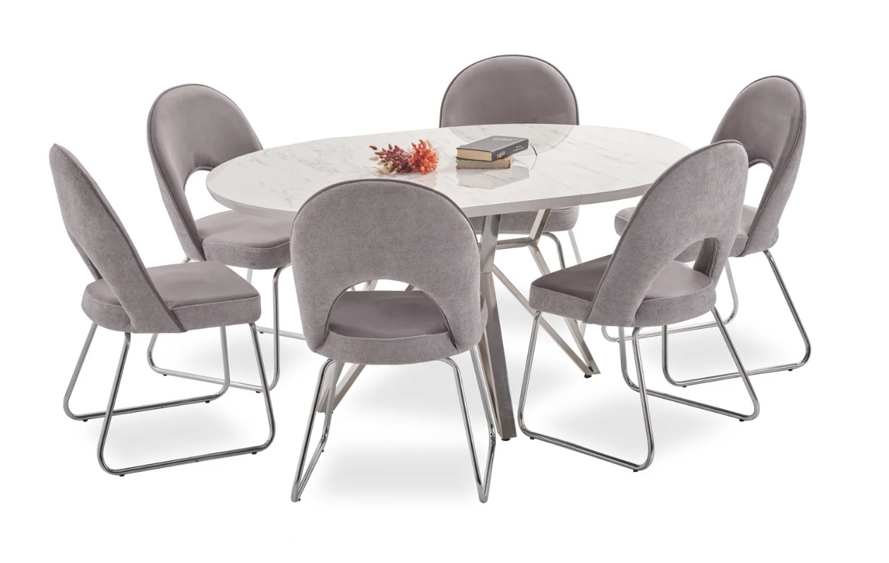 De Luxe eethoek set eettafel 4x stoelen hout stoel textiel eetset garnituur nieuw is de perfecte combinatie van stijl en functionaliteit voor elke eetkamer. Deze set bestaat uit een elegante eettafel en vier comfortabele stoelen, alle uitgevoerd in een verfijnde grijze kleur. De tafel heeft een MDF tafelblad en sterke roestvrijstalen poten, wat garant staat voor duurzaamheid en stabiliteit. Daarnaast is de tafel uitschuifbaar, waarbij de kleinere variant van ø 120 cm verlengd kan worden tot 160 cm, en de grotere variant van ø 140 cm tot 180 cm. Dit maakt de eettafel uiterst flexibel en geschikt voor zowel kleinere als grotere gezelschappen.