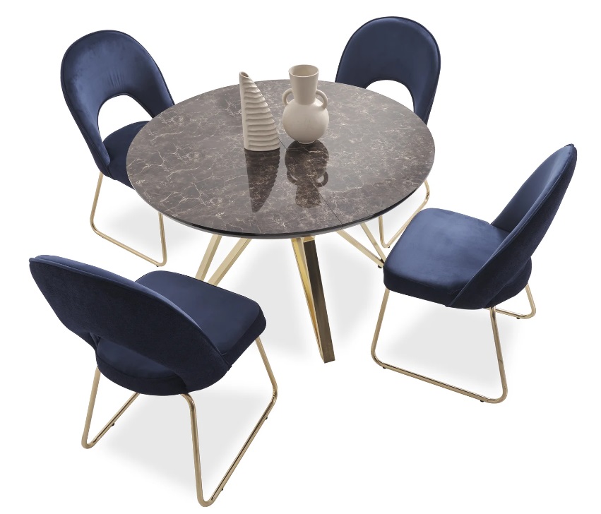 De 'Luxe eetkamerset eetkamertafel 4x stoelen textiel eethoek modern garnituur nieuw' biedt een eigentijdse en stijlvolle aanvulling op elke eetkamer. Deze set bestaat uit een voorziene eetkamertafel met een diameter van ca. 120 cm, die met een simpele handeling is uit te breiden tot een lengte van 160 cm - perfect voor diners of speciale gelegenheden. De elegante combinatie van het robuuste MDF tafelblad met roestvrijstalen poten zorgt niet alleen voor stevigheid, maar ook voor een moderne uitstraling. De bijpassende stoelen hebben een comfortabele zitting van hoogwaardig textiel, gesitueerd op sterke poten. Met een zithoogte van ca. 47 cm en een zitdiepte van ca. 45 cm, zijn de stoelen ontworpen om lang comfort te bieden tijdens uitgebreide diners.