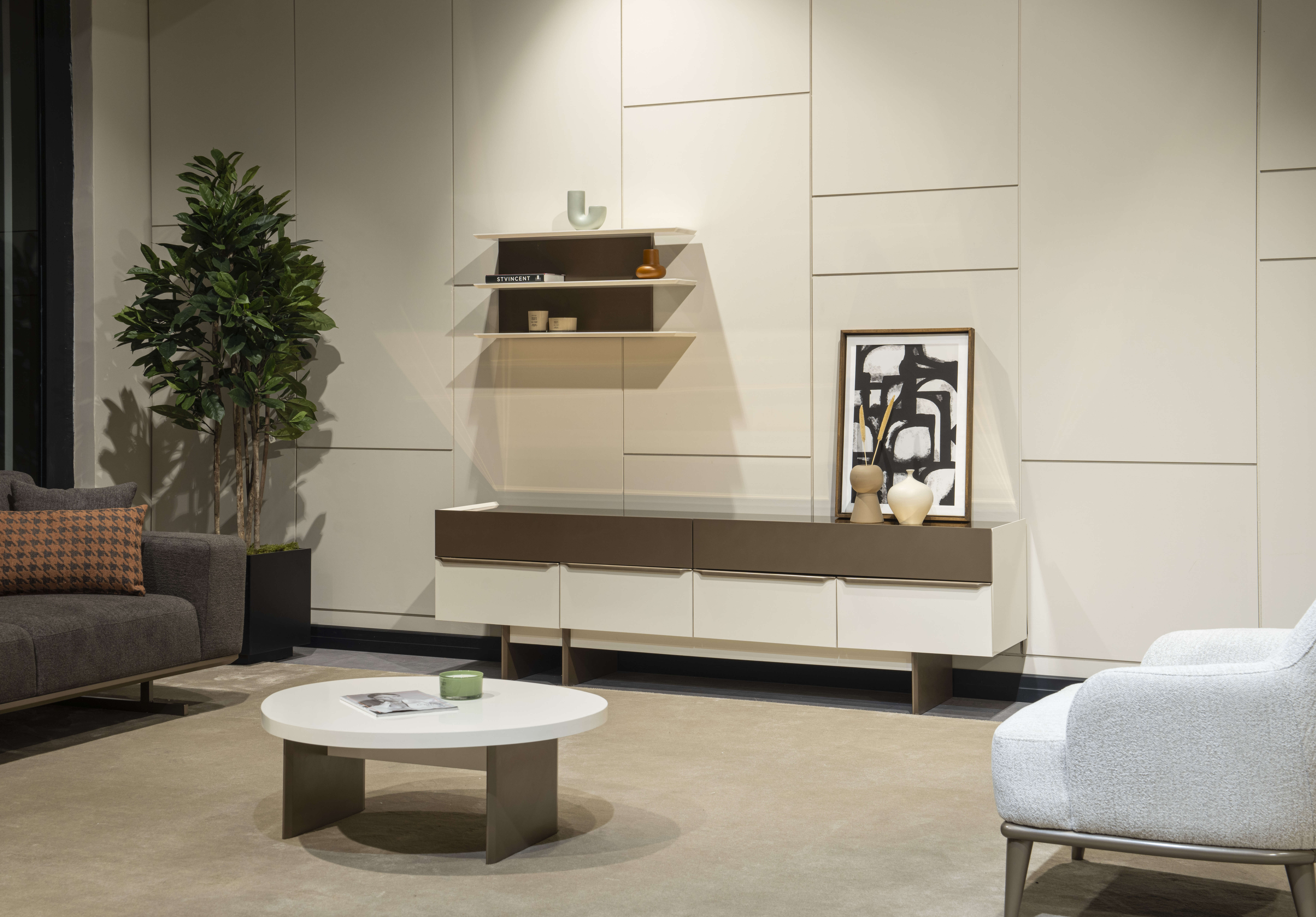 Deze moderne beige-bruine woonkamer set bestaande uit salontafel, dressoir en