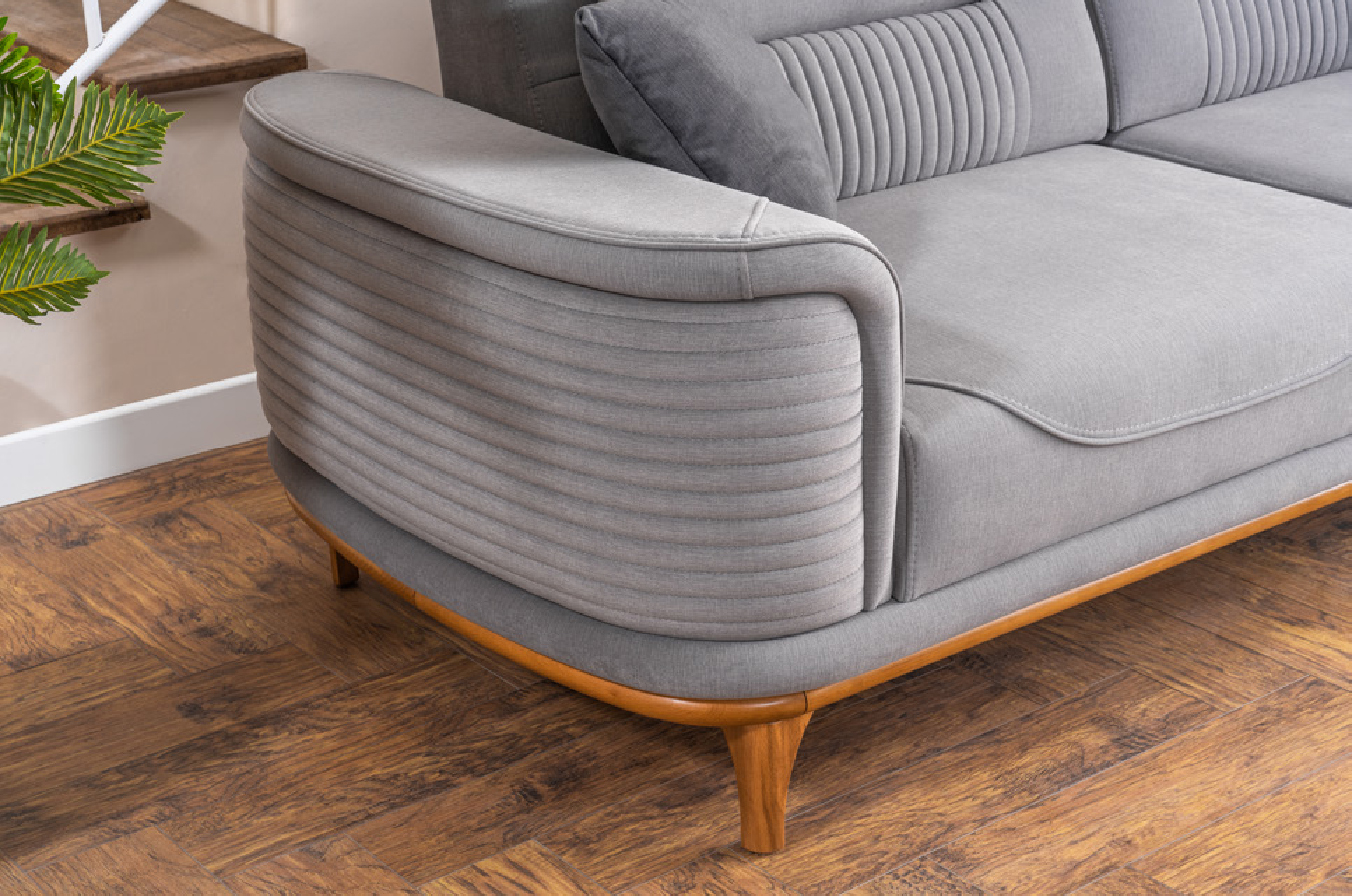 Het 'Modern grijs 2-delig woonkamerstel driezitsbank en fauteuil' biedt een stijlvol en comfortabel zitarrangement voor uw woonkamer. Met zijn moderne vormgeving in grijstinten, past het perfect in elk eigentijds interieur. De **driezitsbank heeft royale afmetingen** van ongeveer 242 x 98 x 95 cm, waardoor u en uw gasten voldoende ruimte hebben om te ontspannen. De zithoogte van ongeveer 42 cm en de zitdiepte van 54 cm zijn ideaal ontworpen voor ultiem comfort, zodat u van lange avonden in gezelschap kunt genieten. Beide stukken zijn vervaardigd met een stevig houten frame en bekleed met hoogwaardig textiel, wat een combinatie van duurzaamheid en esthetische aantrekkingskracht biedt.