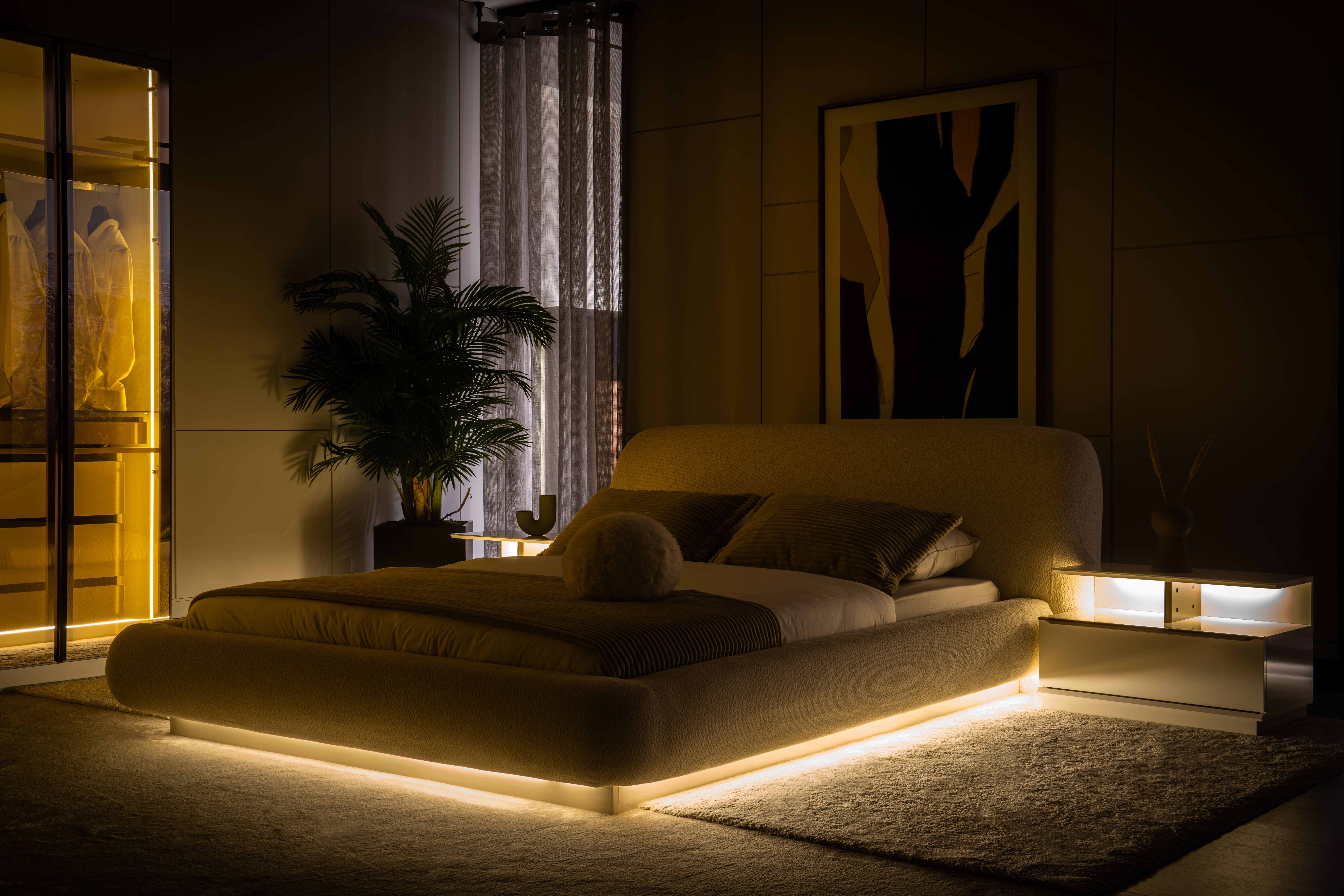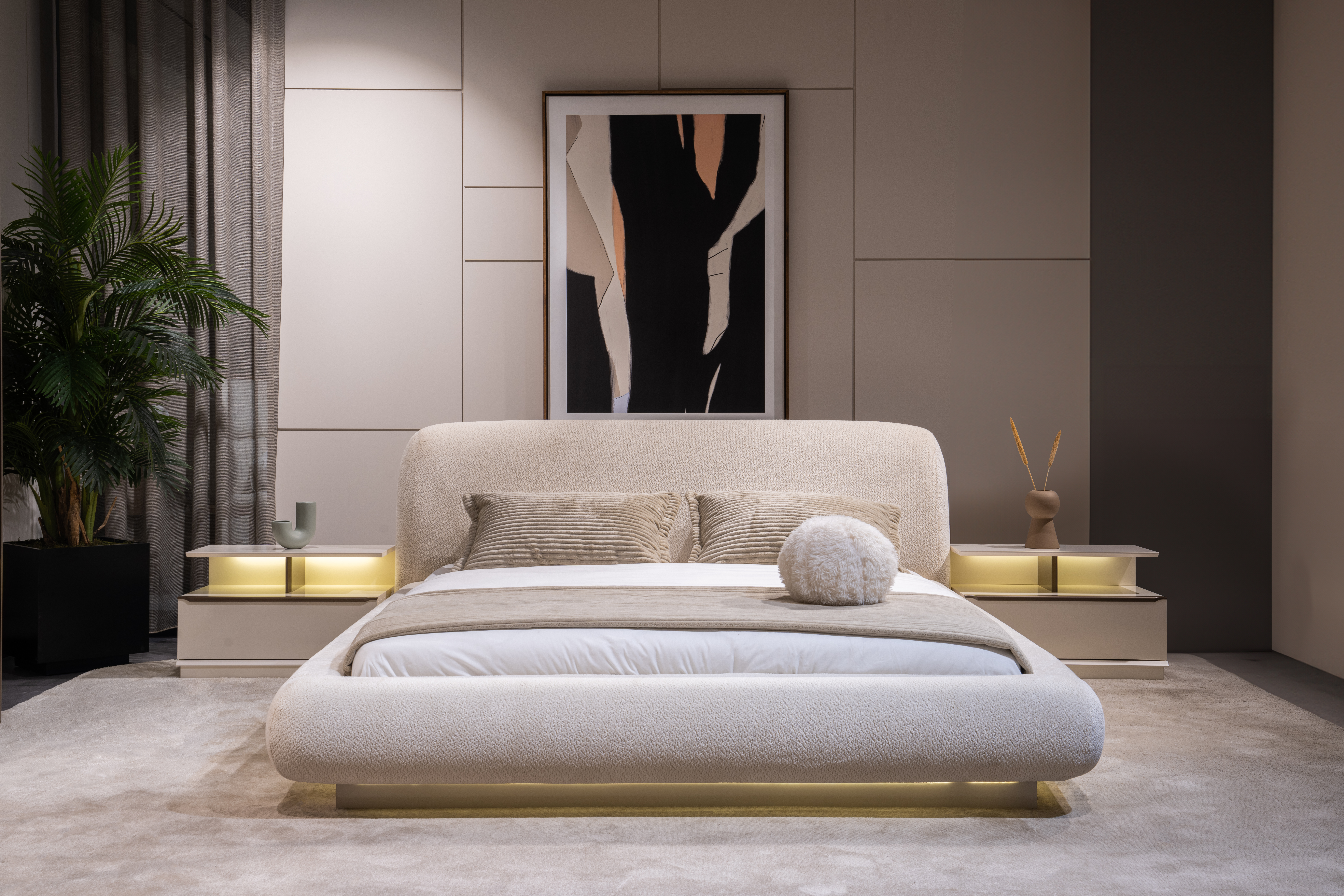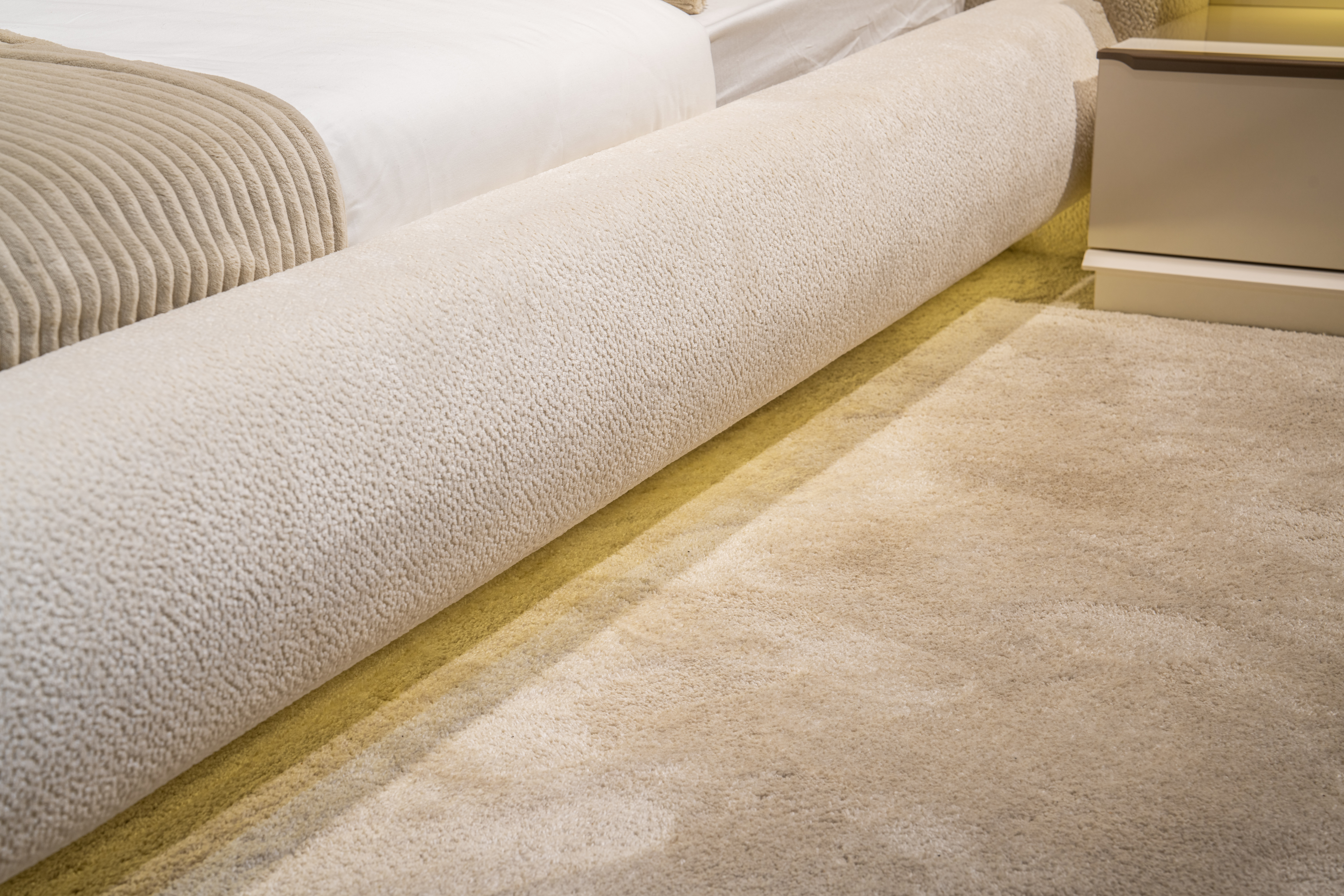 .- Luxueus ontwerp: Het gestoffeerde bed valt op door zijn hoogwaardige textielbekleding en het elegante witte ontwerp, dat elke slaapkamer een moderne uitstraling geeft.