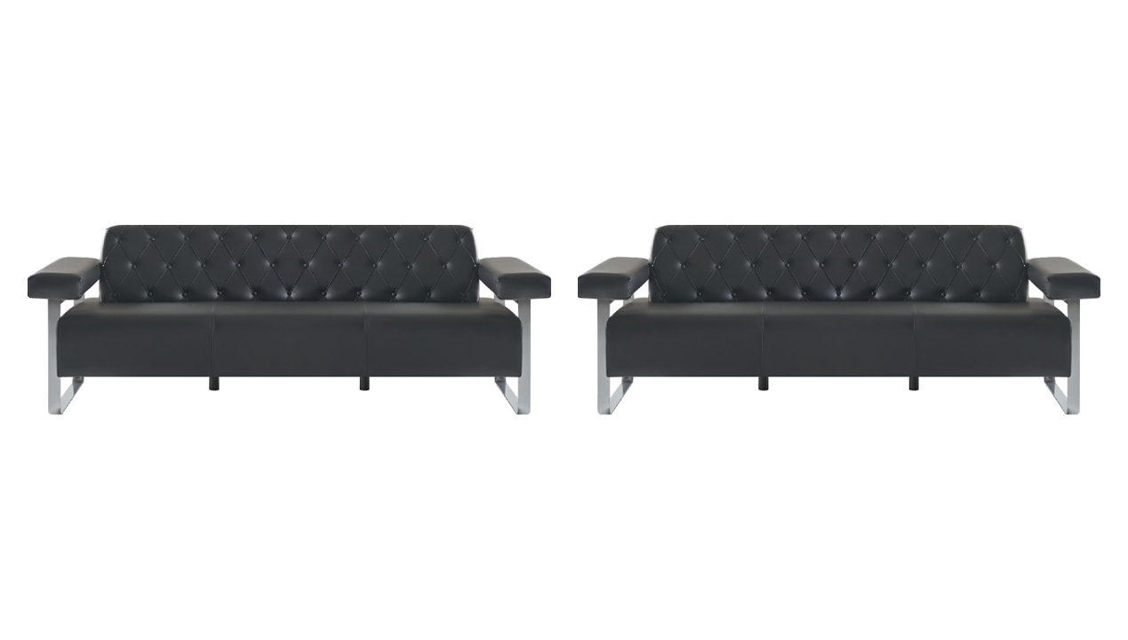 De Sofa-set kantoor lederen sofas 2-delig 3-zits Chesterfield straalt luxe en moderne elegantie uit, perfect voor zowel professionele als huiselijke ruimtes. Deze stijlvolle set bestaat uit twee driezitsbanken met een indrukwekkende afmeting van ca. 210 x 90 x 73 cm per stuk. De strakke, zwarte afwerking in hoogwaardig kunstleer zorgt voor een verfijnde look, terwijl de stevige constructie van hout en roestvrij staal duurzaamheid en stabiliteit garandeert. De zitbanken bieden comfortabele kussens met een zithoogte van ca. 44 cm en een zitdiepte van ca. 56 cm, wat voldoende ruimte biedt voor een ontspannende zitervaring.