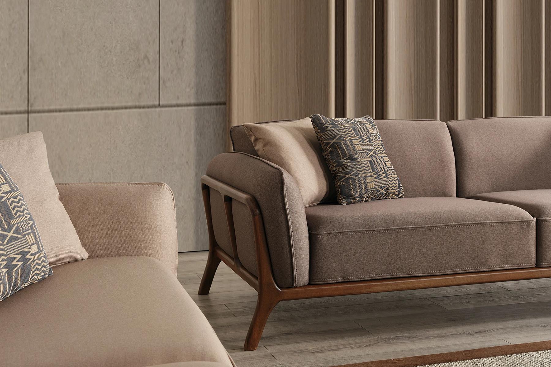De bankenset is ontworpen in een elegante combinatie van beige en bruin,