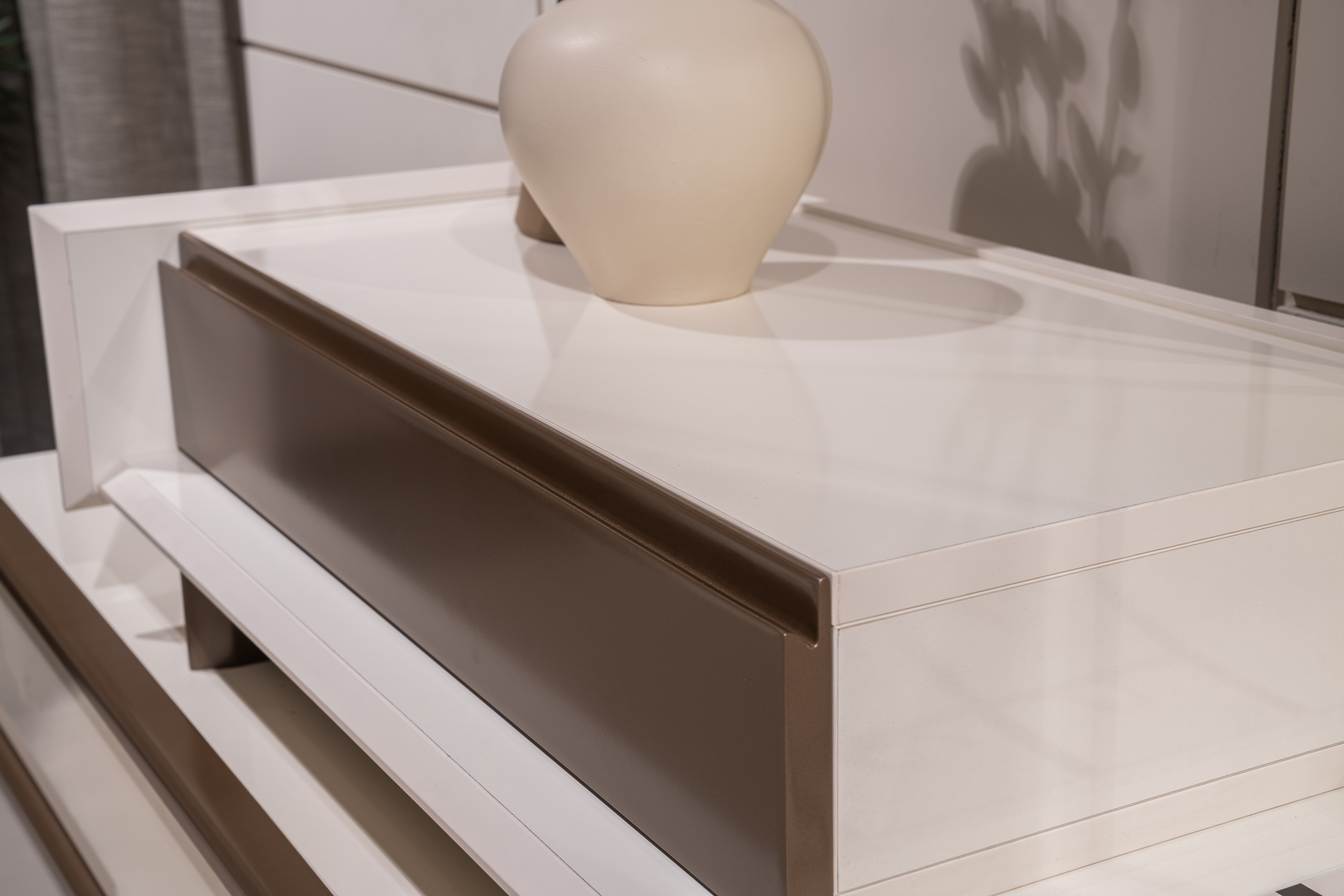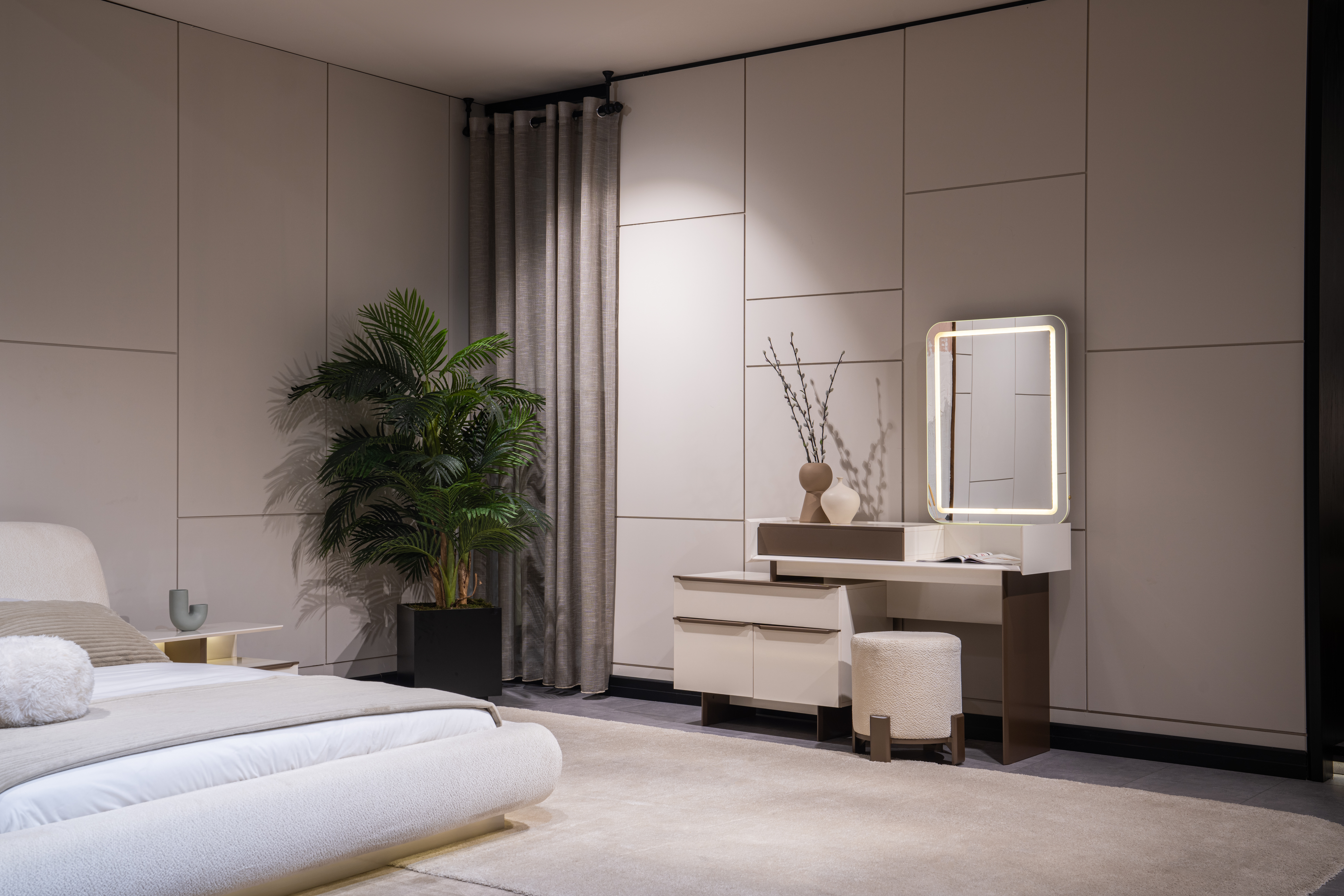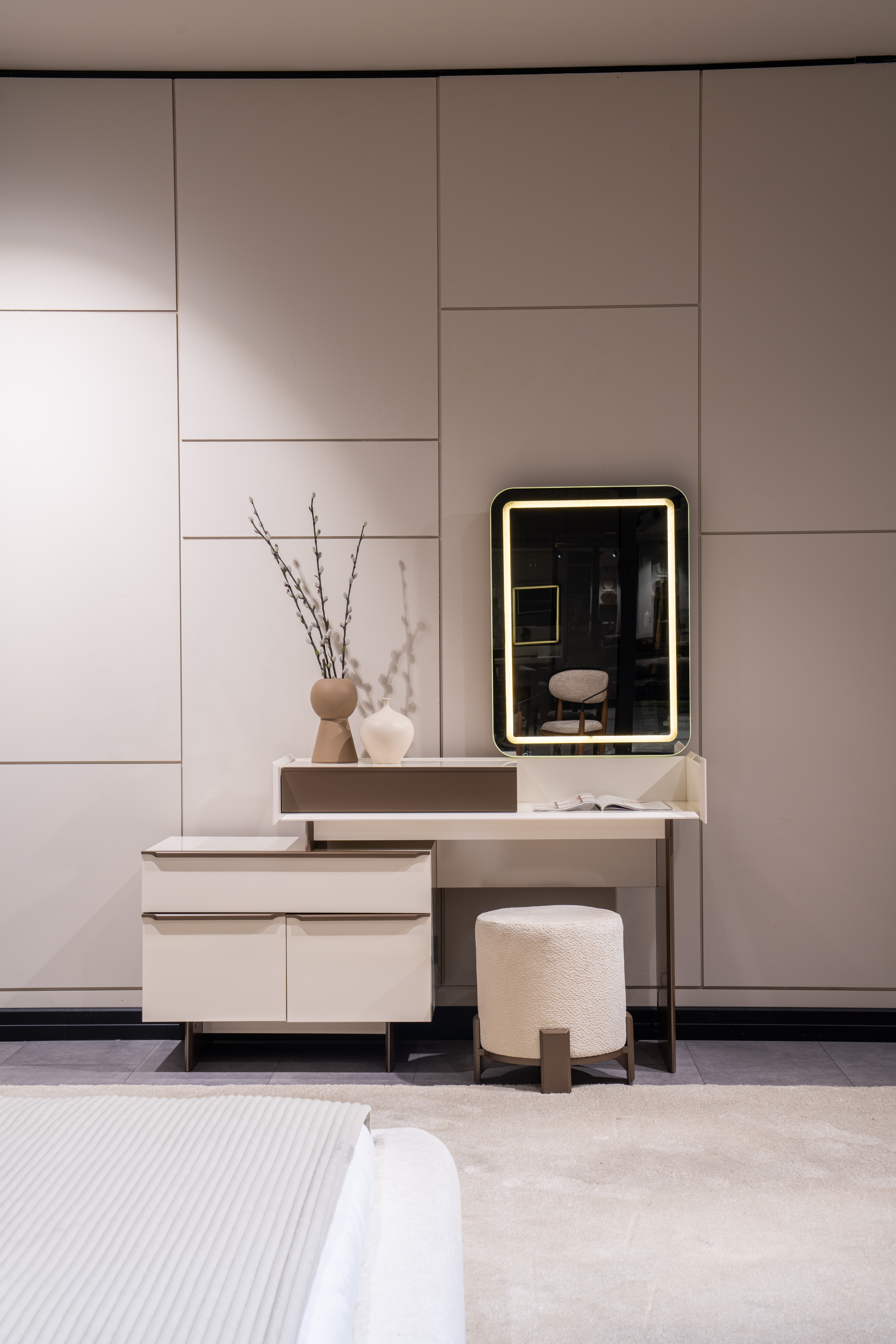 Naast het luxueuze ontwerp biedt deze slaapkamerset ook veel functionaliteit geschikt voor diverse gebruiksscenario's. De kaptafel en kruk combineren stijl met praktisch gebruik, ideaal voor uw dagelijkse routines van verzorging en opmaak. Voor degenen die op zoek zijn naar een unieke uitstraling, biedt deze set de mogelijkheid tot kleurkeuze naast het klassieke wit, zodat de set naadloos kan worden geïntegreerd in uw persoonlijke interieurstijl. Bovendien is de set ontworpen om ruimte optimaal te benutten, wat het uitermate geschikt maakt voor zowel grote als compacte slaapkamers. De veelzijdigheid en het gemak waarmee deze set kan worden aangepast en gebruikt, maken het een perfecte aanvulling op elke moderne woonruimte.