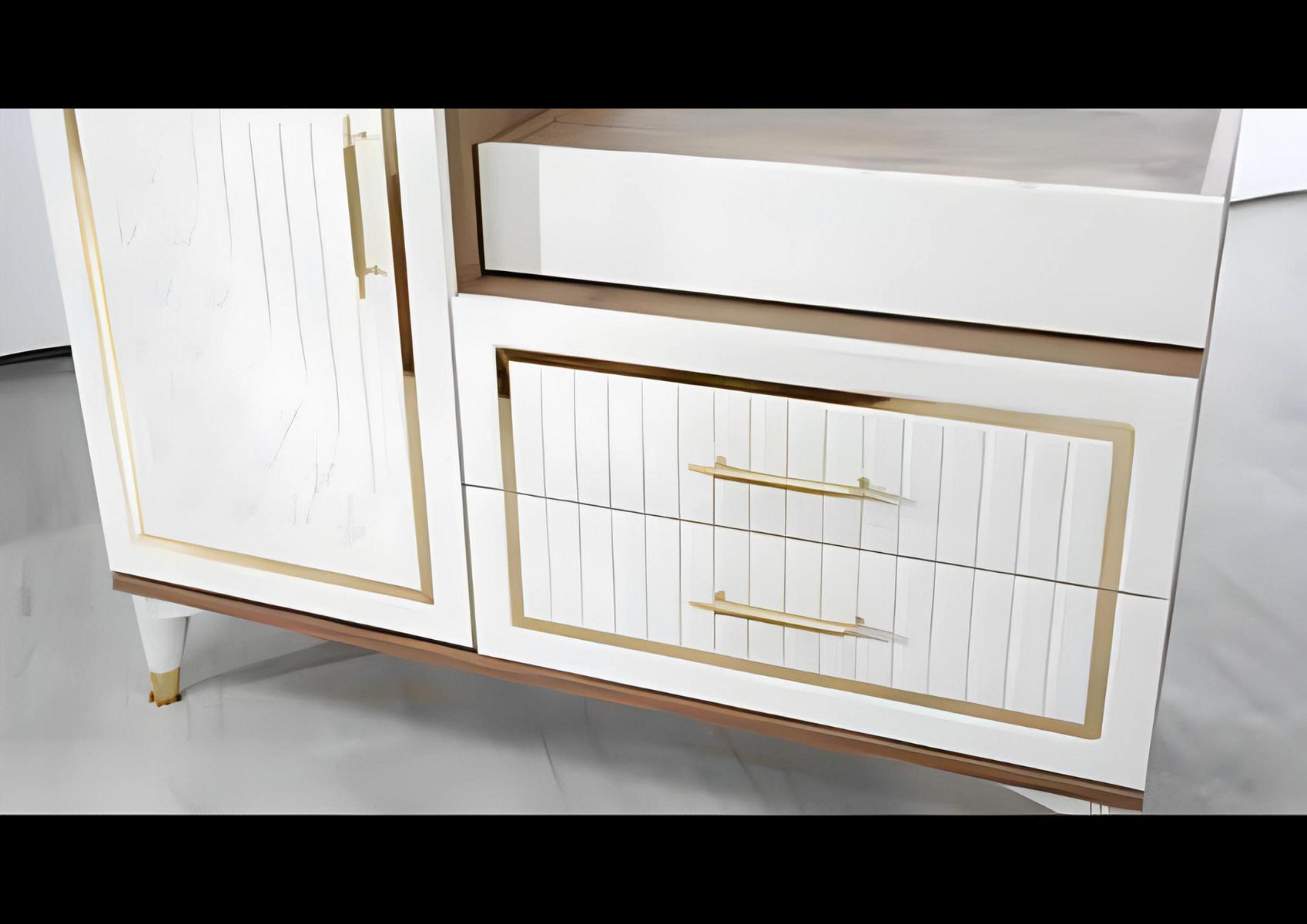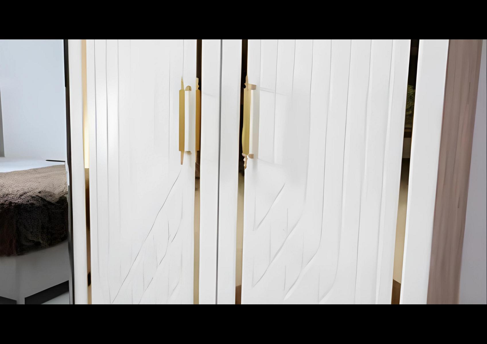 De 'Wit-gouden slaapkamerset', bestaande uit een bed, kledingkast en ladekast, is de ultieme combinatie van stijl en functionaliteit. Het bed heeft een royaal matrasoppervlak van 160 cm x 200 cm en een elegante hoogte van 125 cm, waardoor u niet alleen comfortabel, maar ook met flair kunt slapen. Het geheel is vervaardigd uit hoogwaardig hout en textiel, wat bijdraagt aan een luxe uitstraling zoals afgebeeld. Met zijn verfijnde witte en gouden accenten, vormt deze set het perfecte middelpunt voor elke moderne slaapkamer en voegt een vleugje klasse toe aan uw interieur.