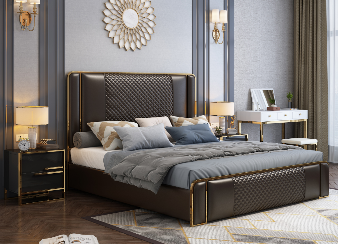 Dit luxe designerbed is een prachtige toevoeging aan elke slaapkamer. Het bed heeft een modern en elegant design, met een beklede fluwelen stof die zorgt voor een luxueuze uitstraling. Met een ligoppervlak van ongeveer 180 x 200 cm biedt dit meubelbed royaal slaapcomfort. Het houten frame en het gebruik van roestvrij staal en kunstleer zorgen voor duurzaamheid en stijl. Met afmetingen van ongeveer 213 x 192 x 140 cm heeft dit bed een ruime en uitnodigende uitstraling, perfect voor een goede nachtrust in stijl.