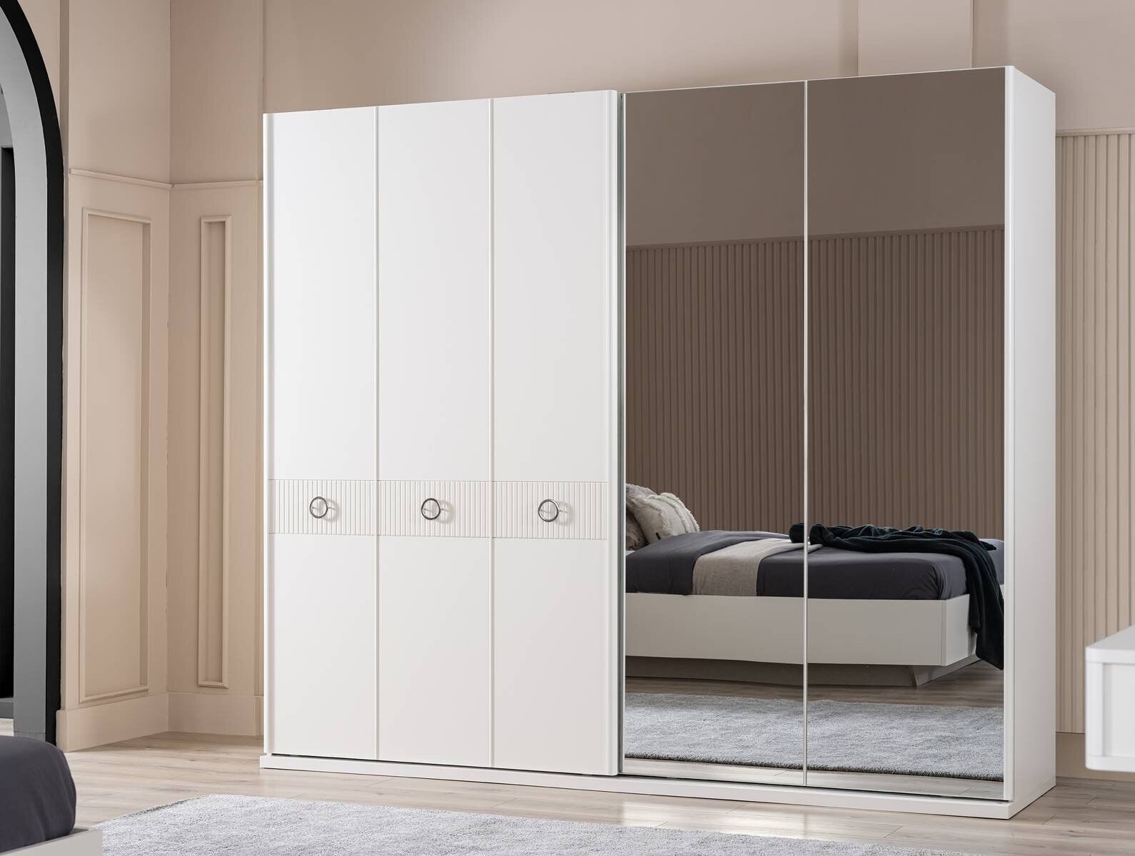 In deze complete slaapkamerset is elk meubelstuk zorgvuldig ontworpen om functionaliteit en stijl te combineren. De ruime kledingkast biedt voldoende opbergruimte voor kleding en accessoires, terwijl de nachtkastjes handig zijn voor het opbergen van persoonlijke spullen. De elegante spiegel voegt een vleugje verfijning toe aan de ruimte, terwijl de hocker kan dienen als extra zitplaats of als decoratief accent. Met deze set kunt u uw slaapkamer moeiteloos transformeren tot een oase van comfort en schoonheid, waar u elke avond met plezier zult ontspannen.