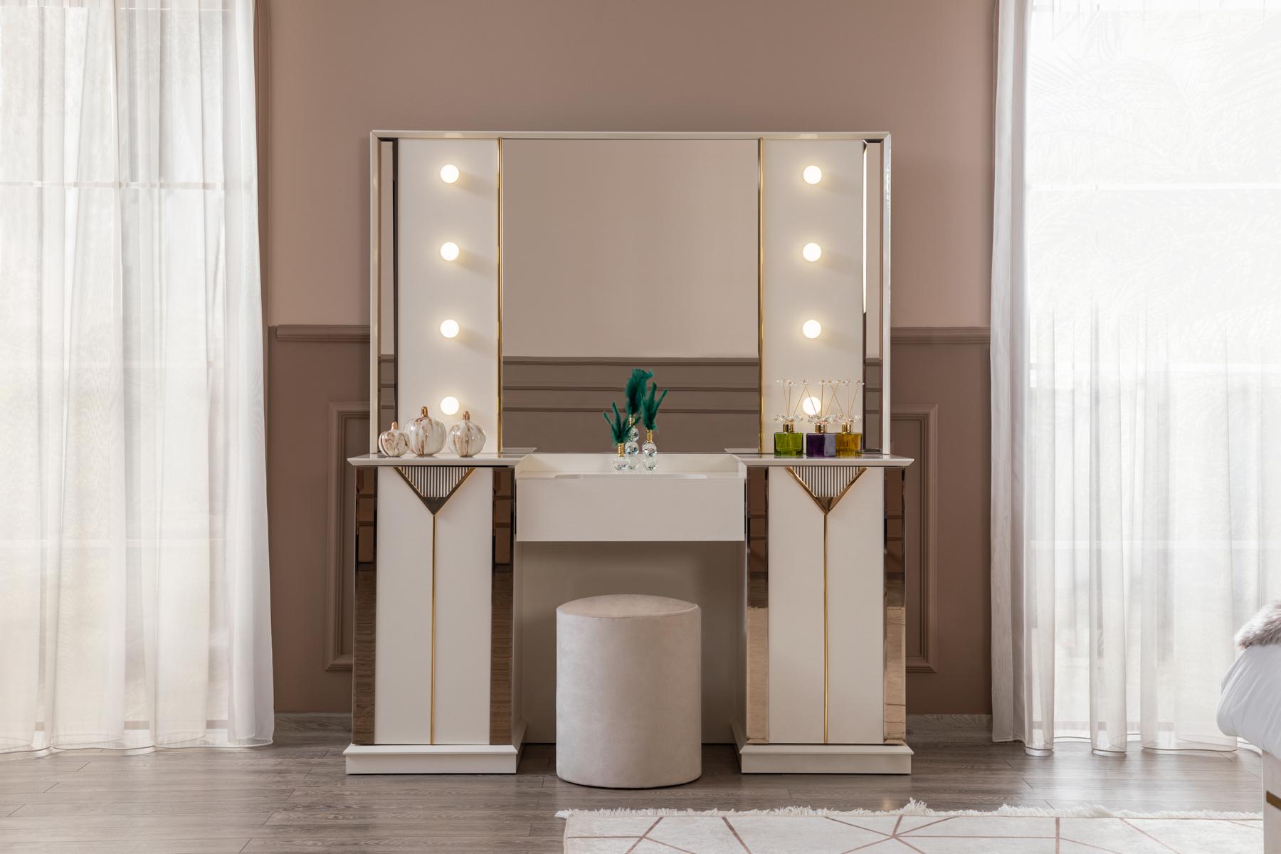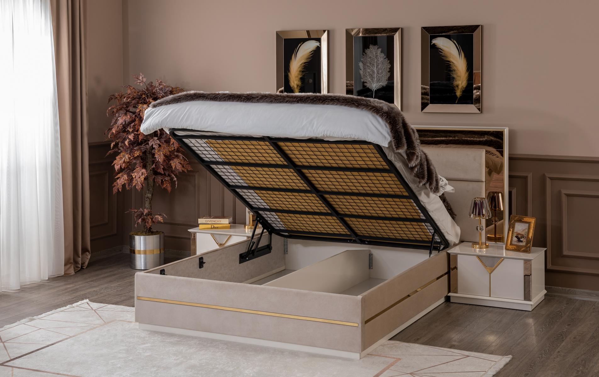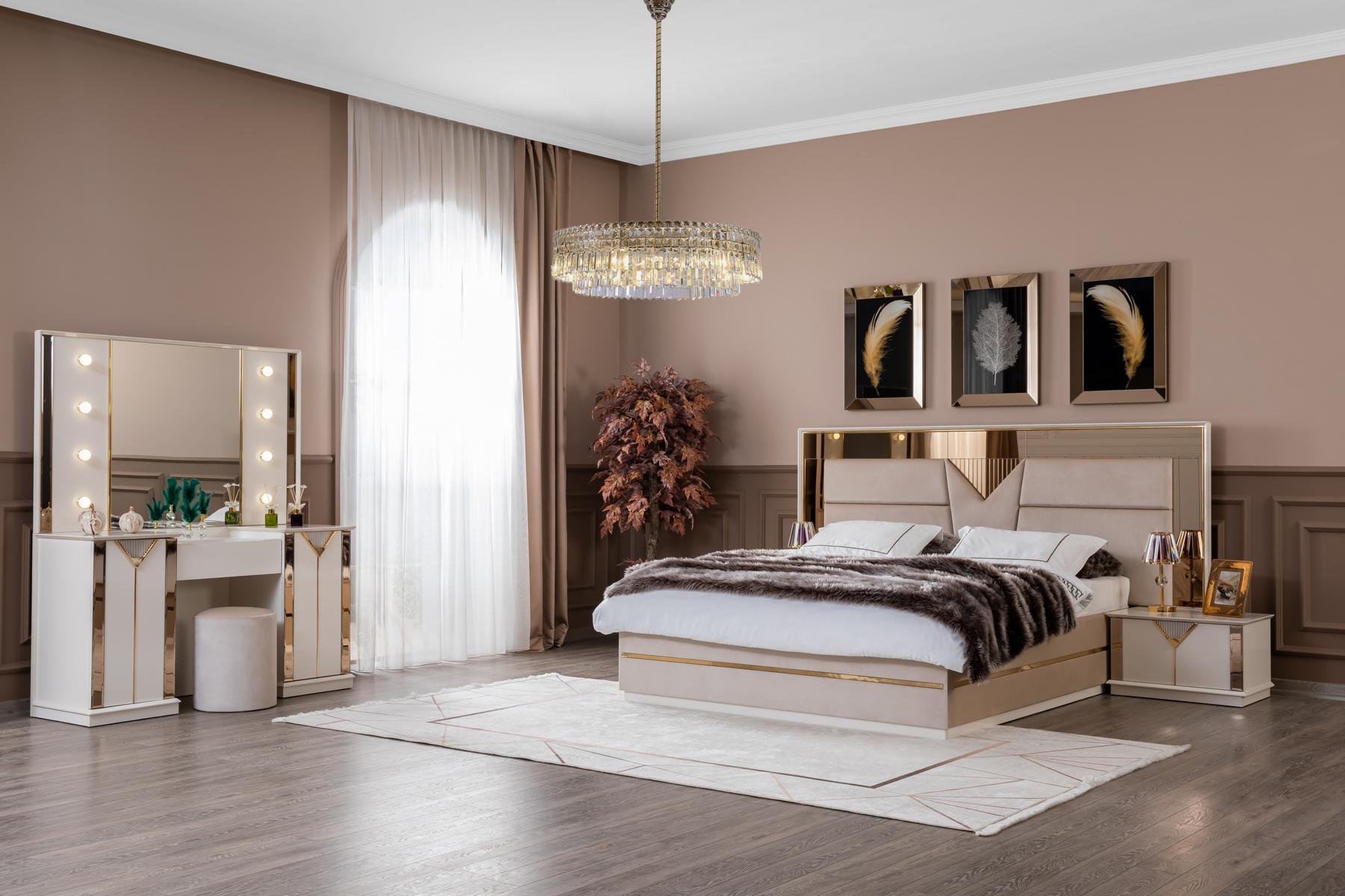 In deze slaapkamer set komen functie en stijl samen, wat zorgt voor een harmonieuze en luxueuze sfeer in elke slaapkamer. Het ruime ligoppervlak van het bed biedt ultiem comfort en rustgevende nachten. De nachtkastjes zijn perfect om essentiële items binnen handbereik te houden, terwijl de make-up tafel met spiegel een prachtige ruimte creëert voor het klaarmaken voor de dag. Zowel voor individueel gebruik als voor koppels is deze set een duurzame investering in kwaliteit en design.