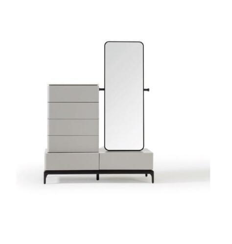 Deze slaapkamer set biedt een complete oplossing voor het inrichten van een eigentijdse slaapkamer. Het bed, voorzien van een luxueus hoofdbord, zorgt voor een comfortabele en stijlvolle slaapomgeving. De twee nachtkastjes bieden handige opbergruimte voor boeken, telefoons en andere persoonlijke items, terwijl de ladekast met spiegel ideaal is voor het opbergen van kleding en accessoires. De spiegel kan tevens dienen als praktische en elegante toevoeging aan de slaapkamer. De tijdloze combinatie van zwart en wit maakt deze set veelzijdig en gemakkelijk te combineren met verschillende kleurenschema's. Een ideaal meubelstuk voor wie op zoek is naar een eigentijdse en minimalistische slaapkamerinrichting.
