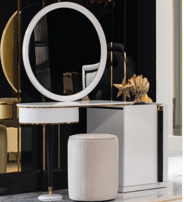 Met deze kaptafel en kruk set creëer je een glamoureuze hoek in je huis waar je jezelf kunt opmaken, je sieraden kunt organiseren of gewoon kunt ontspannen. De ruime tafel biedt voldoende ruimte voor al je make-up en accessoires, terwijl de comfortabele kruk zorgt voor een aangename zitplek. Of je nu een liefhebber bent van make-up, een sieradenliefhebber bent of gewoon een elegante en praktische plek wilt hebben om jezelf te verwennen, deze set is een must-have. Verwen jezelf met dit hoogwaardige, stijlvolle en functionele meubelstuk voor een complete en luxe ervaring in je eigen huis.
