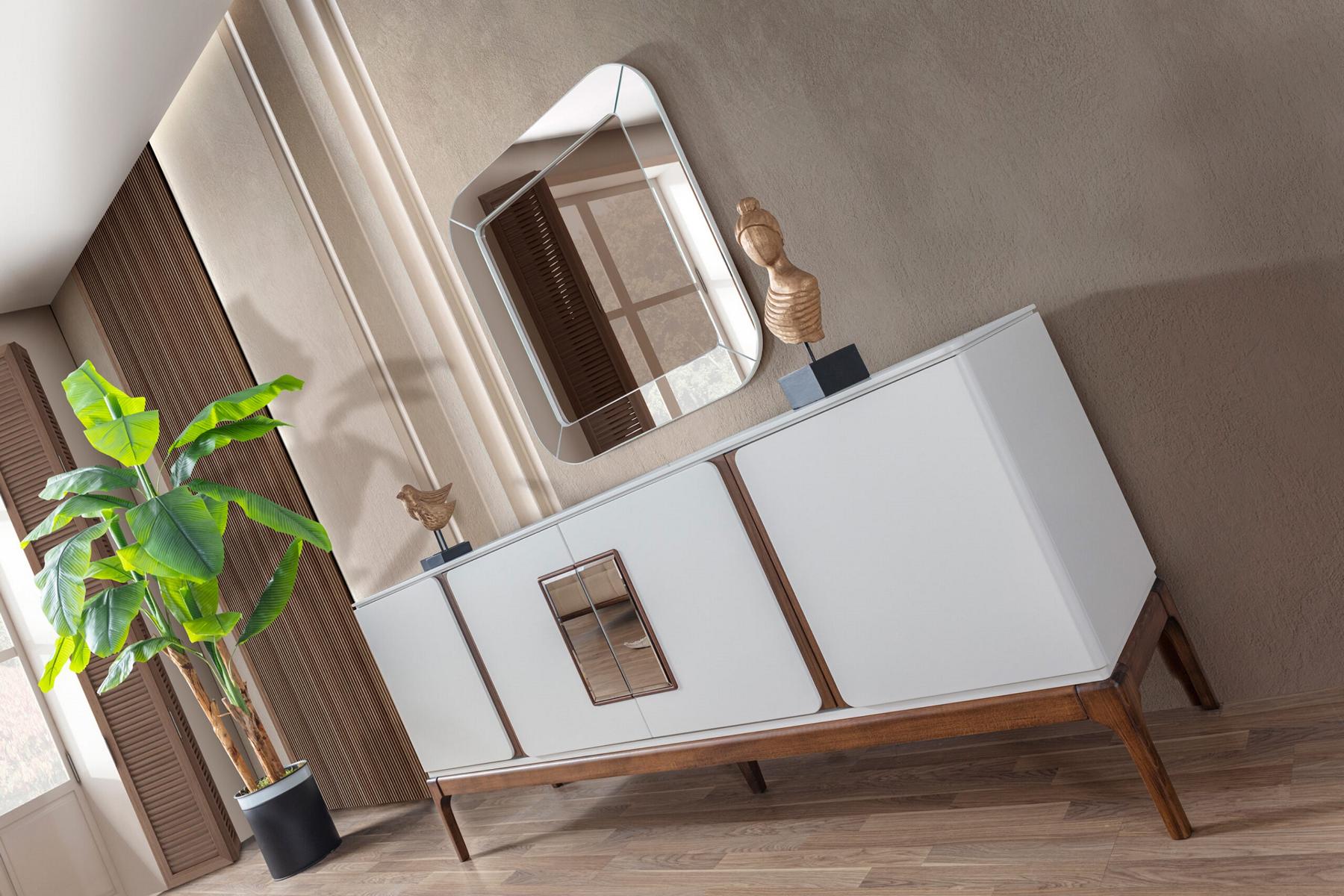 In deze luxe eetkamer set komt functionaliteit samen met een modern en verfijnd design. Het dressoir kan dienen als eyecatcher in de eetkamer en biedt tegelijkertijd praktische opbergruimte. De spiegel reflecteert het licht in de ruimte en laat de eetkamer optisch groter lijken. Plaats de set in het middelpunt van je eetkamer en creëer een sfeervolle en uitnodigende omgeving voor gezellige diners met vrienden en familie. Deze set is perfect voor liefhebbers van eigentijdse interieurs die op zoek zijn naar een combinatie van elegantie en functionaliteit.