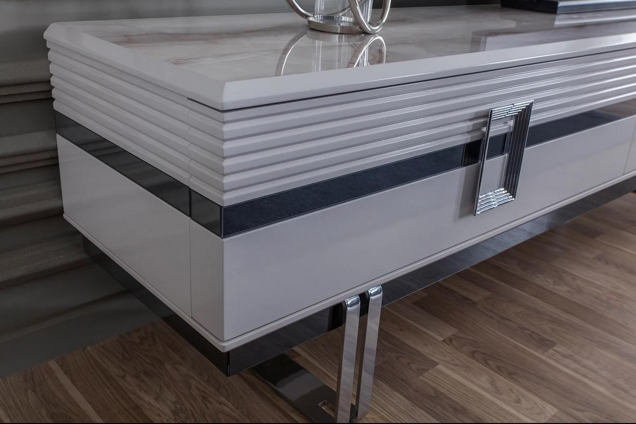 Moderne woonkamer wand bestaat uit 4 delen in exclusief wit woonkamermeubilair biedt stijlvolle functionaliteit voor elke moderne woonkamer. De combinatie van hout, RVS en glas geeft deze wand een eigentijdse uitstraling die moeiteloos elke ruimte verfraait. Met een afmeting van ca. 217 x 49 x 62 cm voor de TV standaard, biedt dit meubel voldoende ruimte voor het plaatsen van jouw televisie en entertainmentapparatuur. De bijgevoegde wandschappen, boekenkast en plank zorgen voor extra opbergruimte en decoratiemogelijkheden.