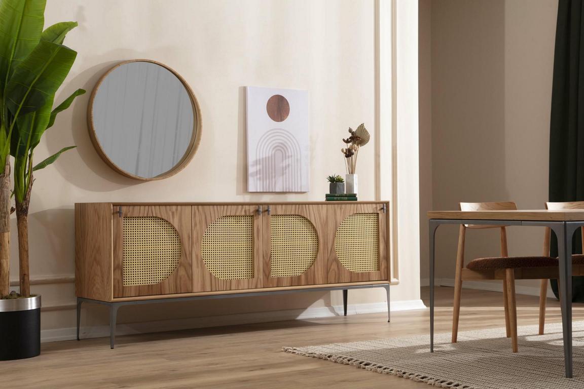 Sideboard met spiegel Dressoir Sideboards Houten kast Meubels Bruin Nieuw: Dit prachtige sideboard met spiegel is een stijlvolle toevoeging aan elk interieur. Met afmetingen van ongeveer 200 x 50 x 80 cm biedt dit meubelstuk voldoende opbergruimte en een handige spiegel van ongeveer Ø 70 x 70 cm. Het houten design in een warme bruine kleur zorgt voor een elegante uitstraling in elke kamer. Het is de perfecte combinatie van functionaliteit en esthetiek, waardoor dit dressoir een essentieel onderdeel van uw huisinrichting wordt.