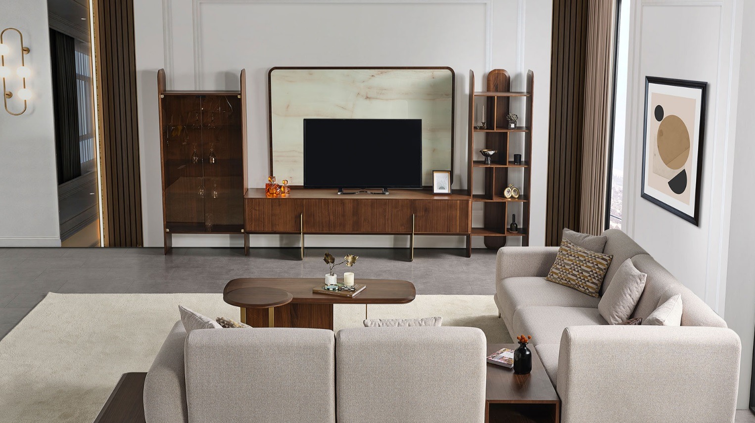 Stijlvolle woonkamerset bestaande uit wandmeubel, salontafel en bijzettafel.